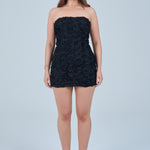 This strapless mini dress is designed to make a bold yet elegant statement. Crafted with intricate floral-textured detailing throughout, the dress adds depth and dimension while maintaining a sleek, feminine silhouette. The strapless neckline highlights the shoulders and décolletage, creating a timeless and flattering look.