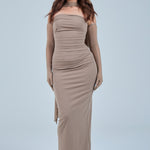 This elegant strapless maxi dress is designed to deliver a sleek, modern silhouette with a soft, elevated finish. Crafted from a smooth, stretch fabric, the dress hugs the body beautifully while offering comfort and flexibility. The straight neckline creates a minimalist, refined look, highlighting the shoulders and collarbone.