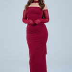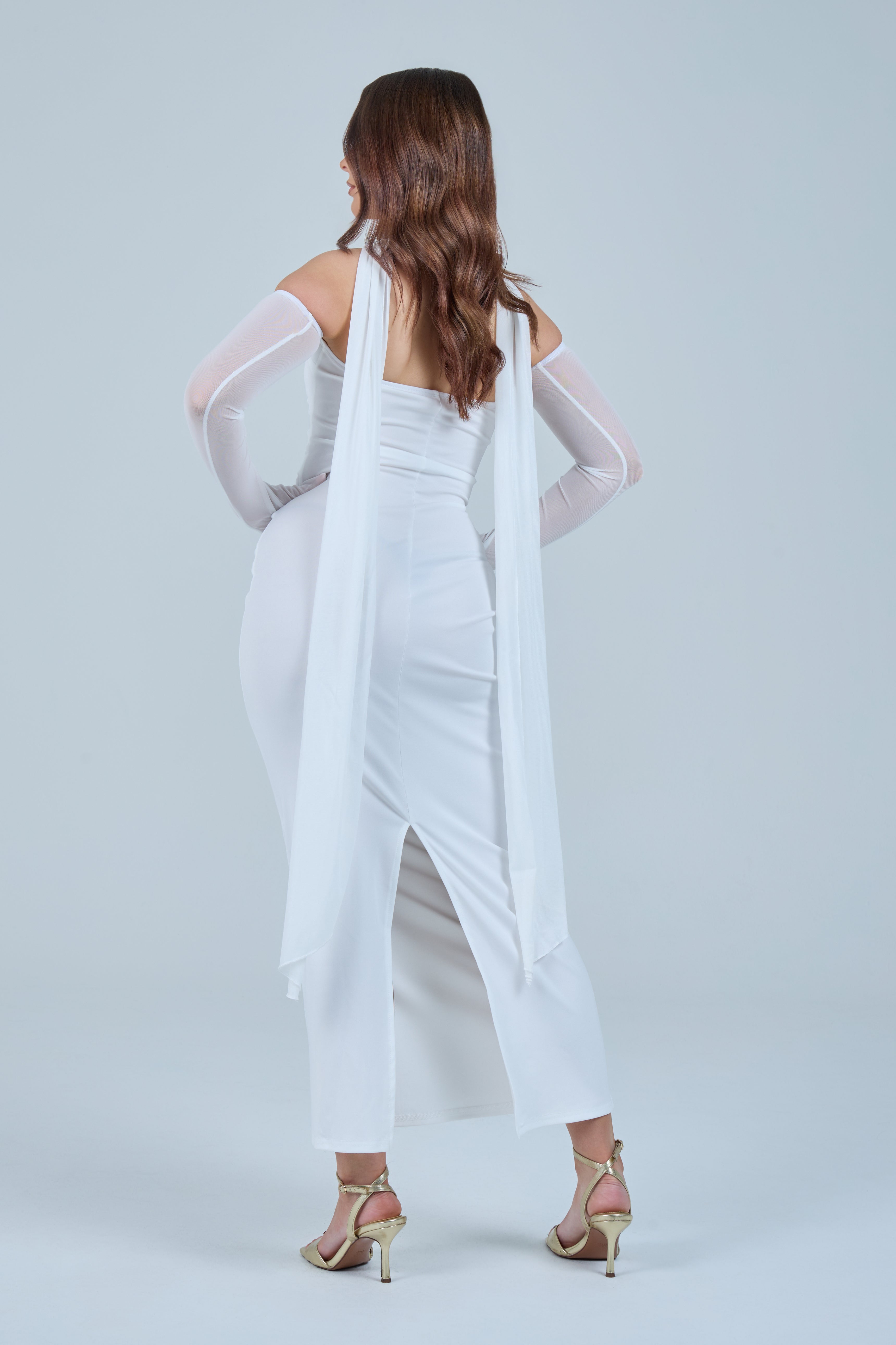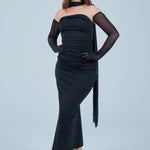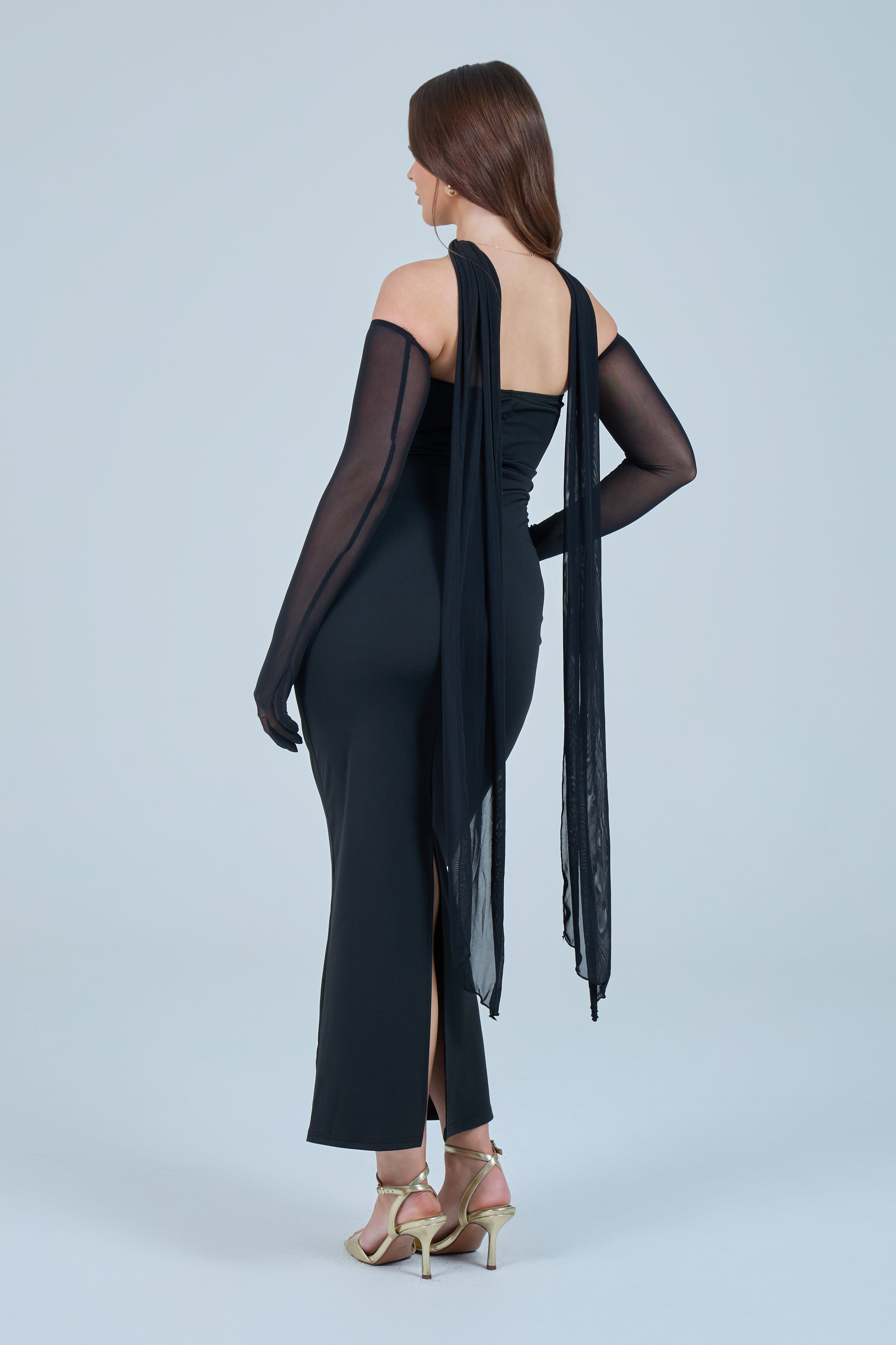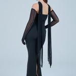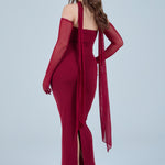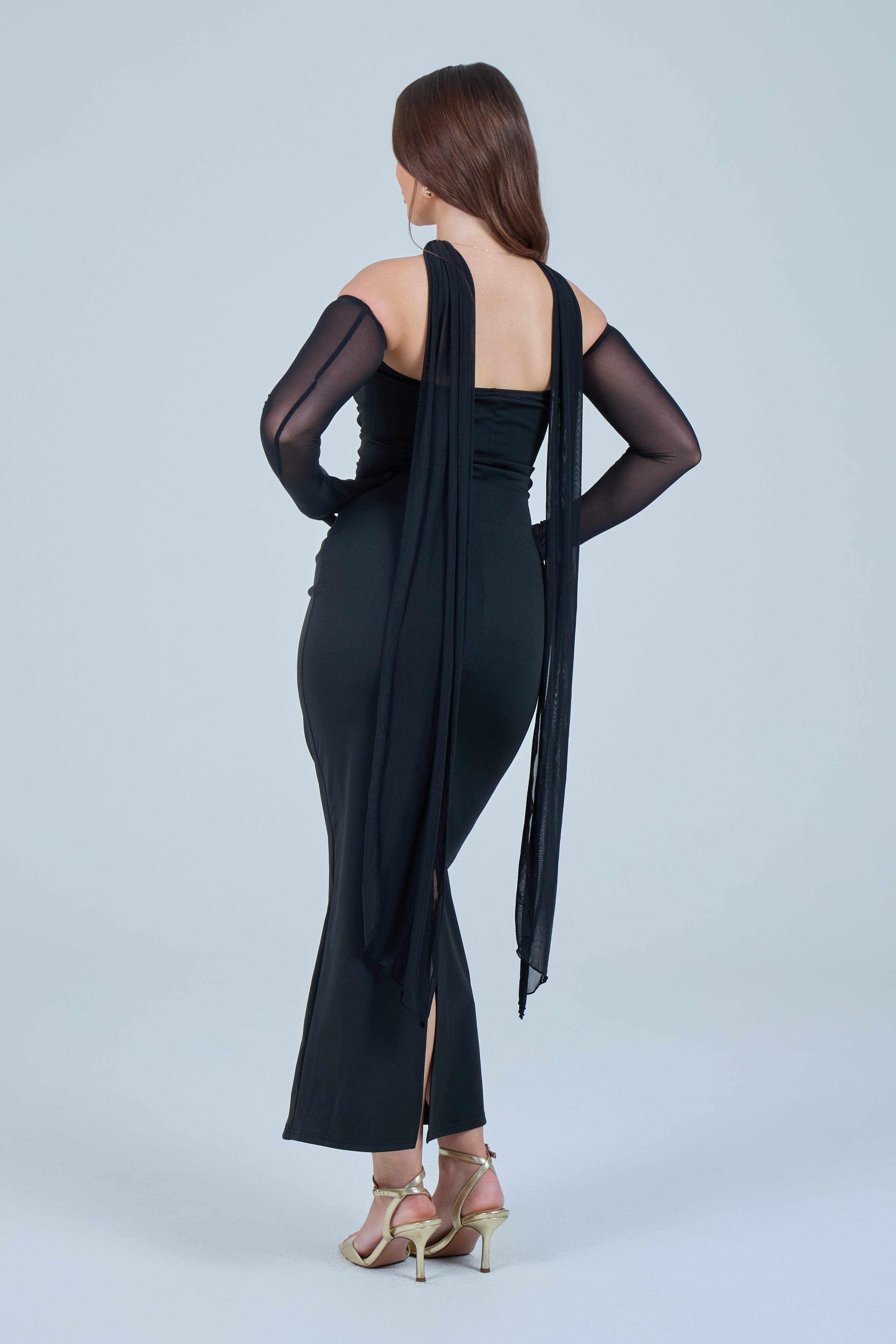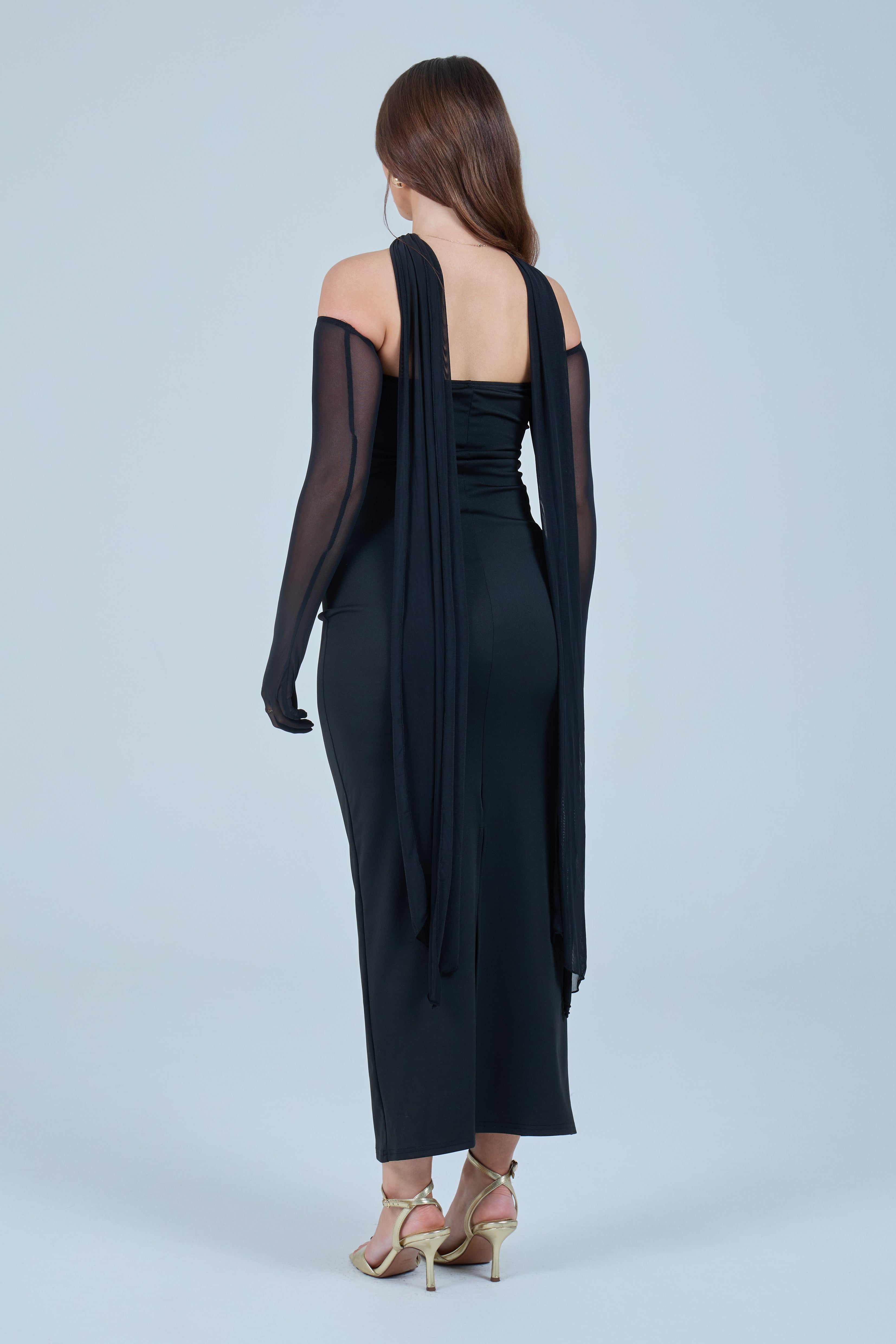 Sheer detachable-style sleeves add a contemporary edge, while the coordinating scarf detail drapes gracefully down the back, creating fluid movement and an understated statement from every angle. The fitted bodice transitions seamlessly into a straight-cut maxi skirt, elongating the figure for a flattering, streamlined appearance.