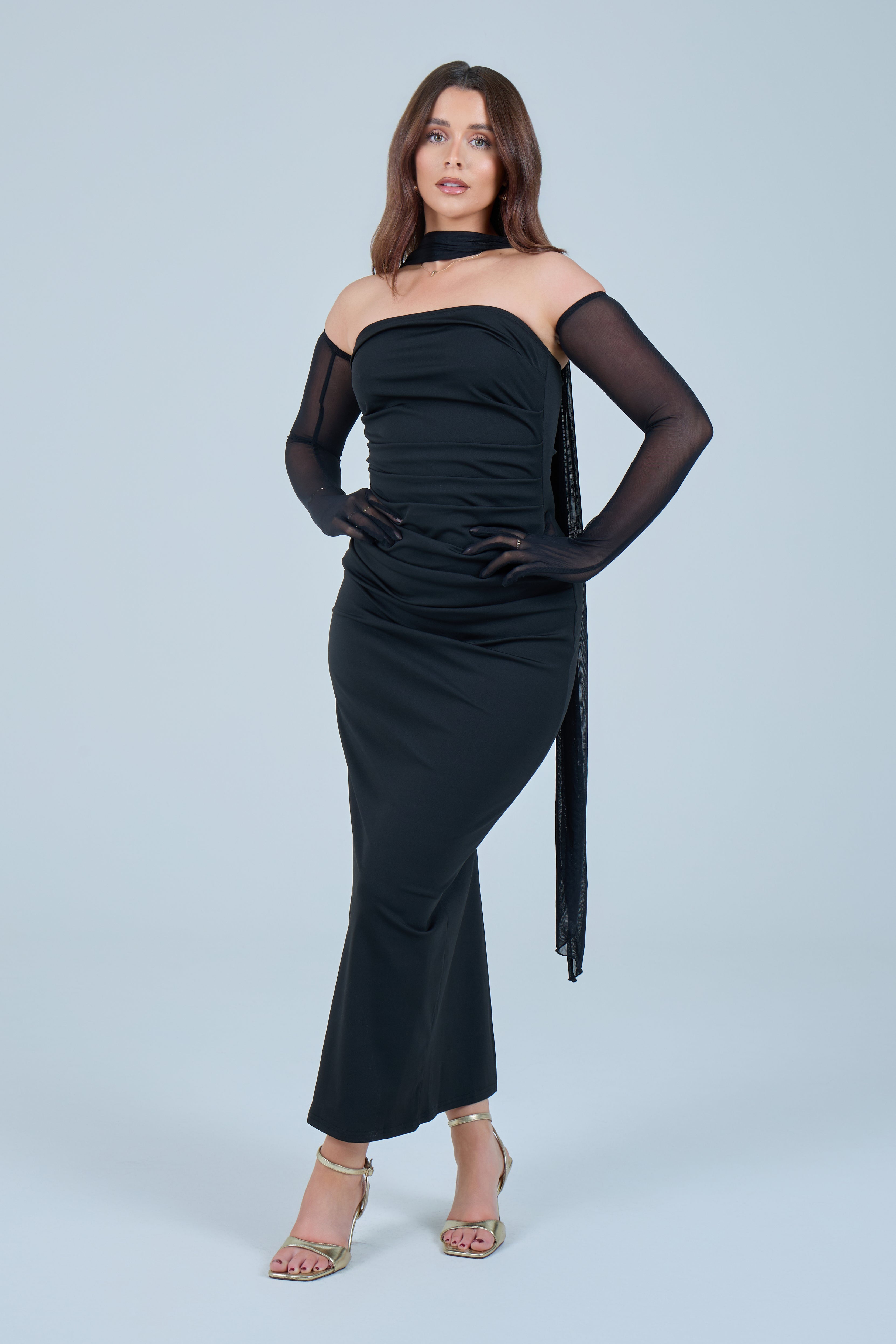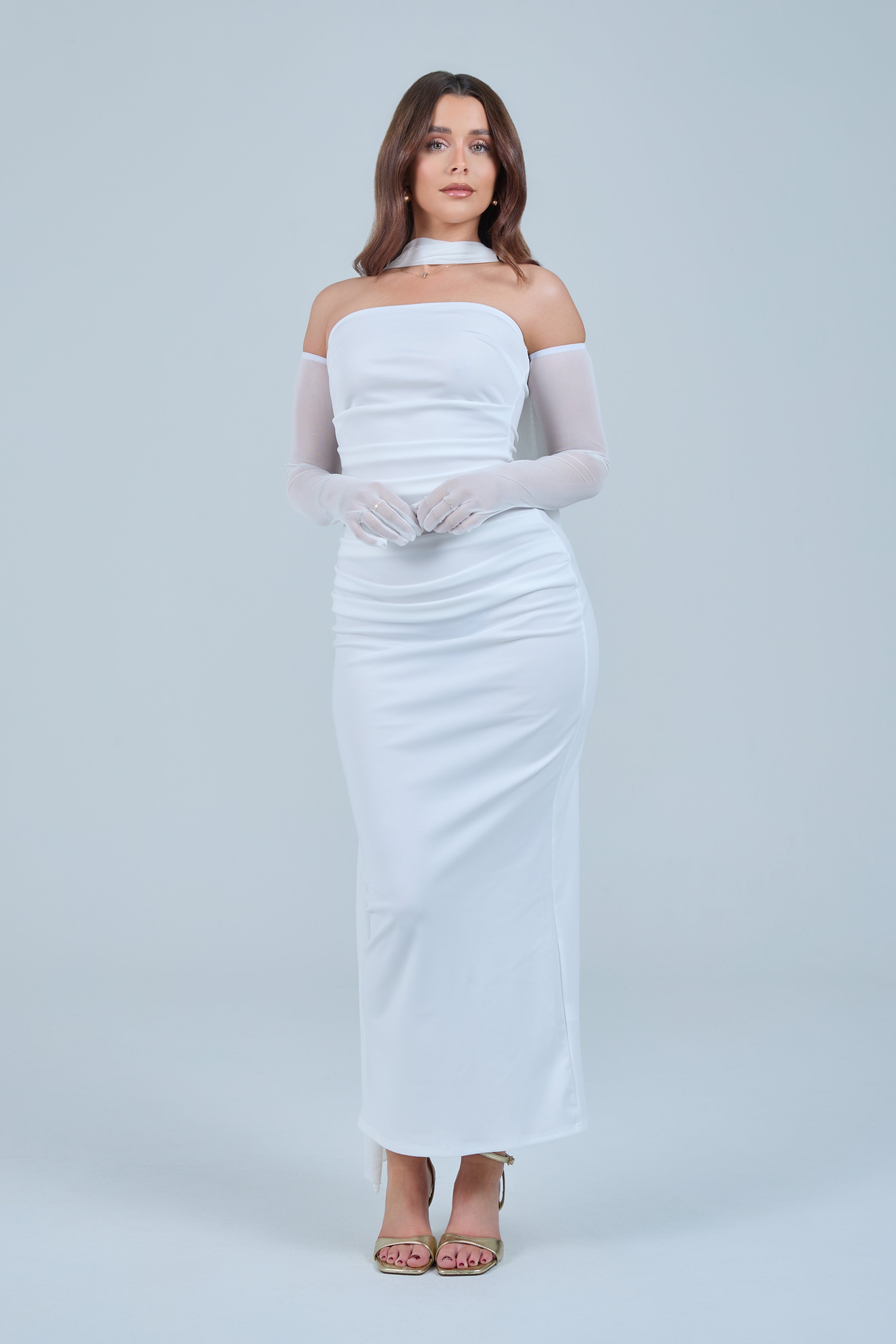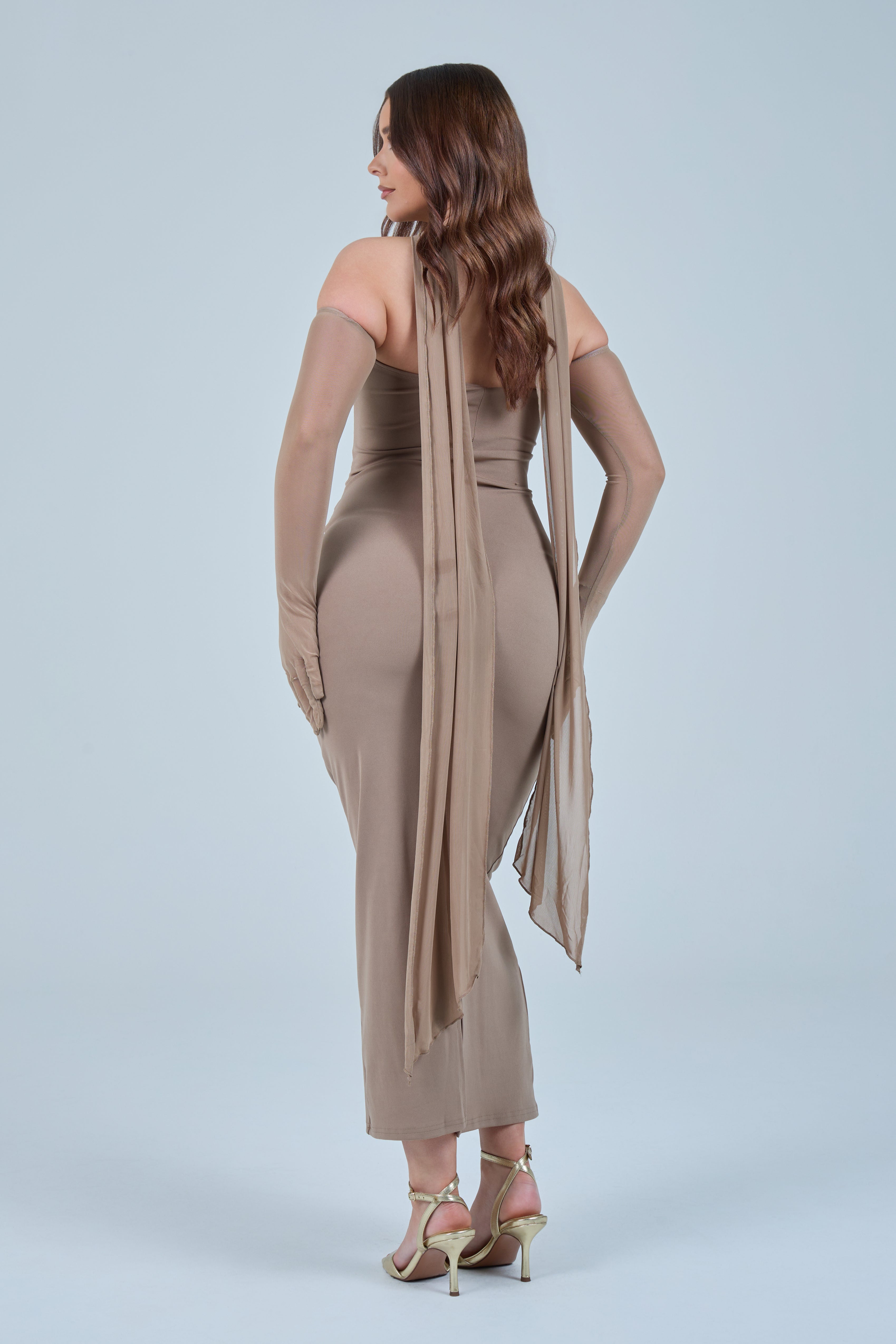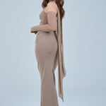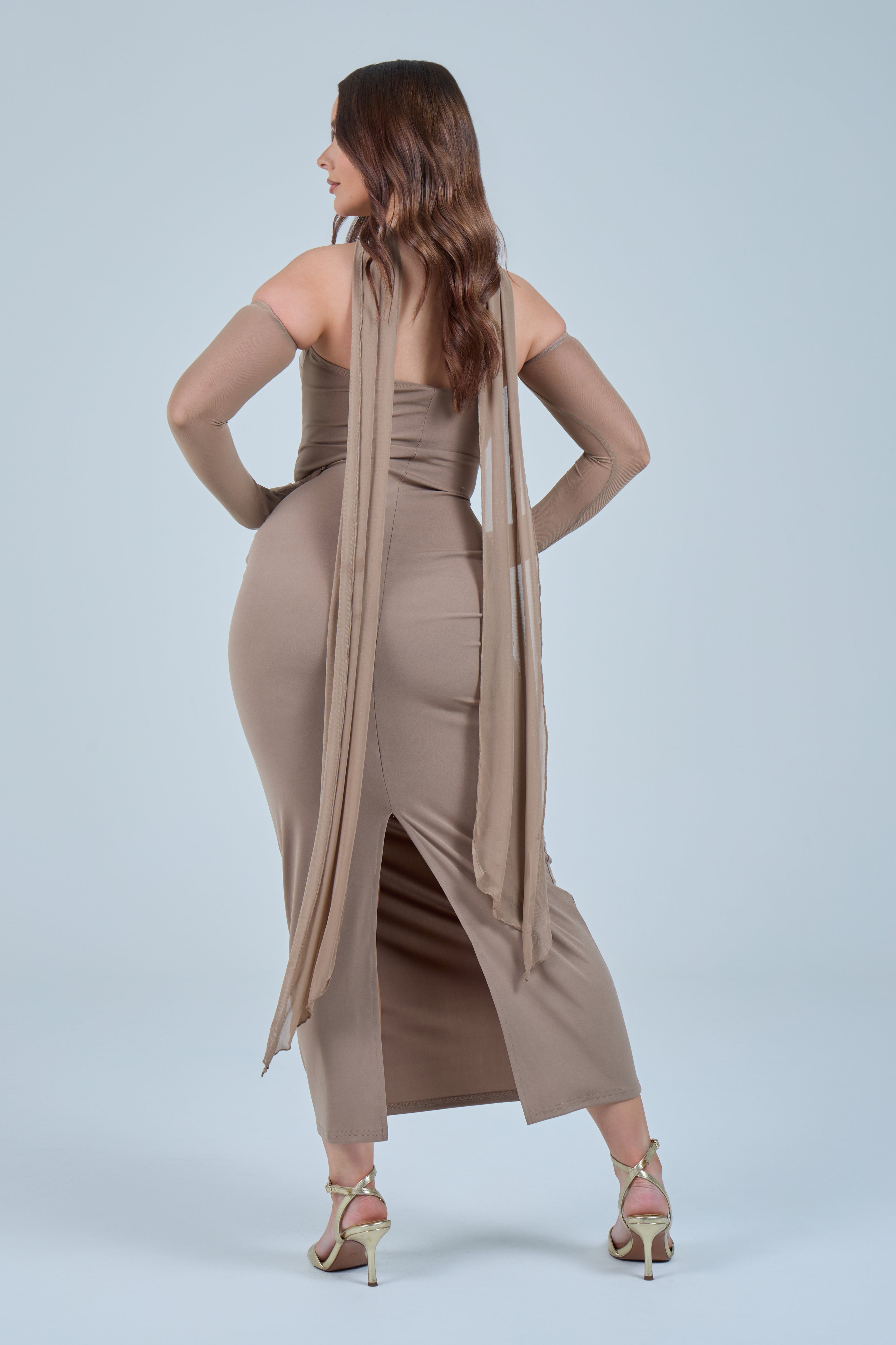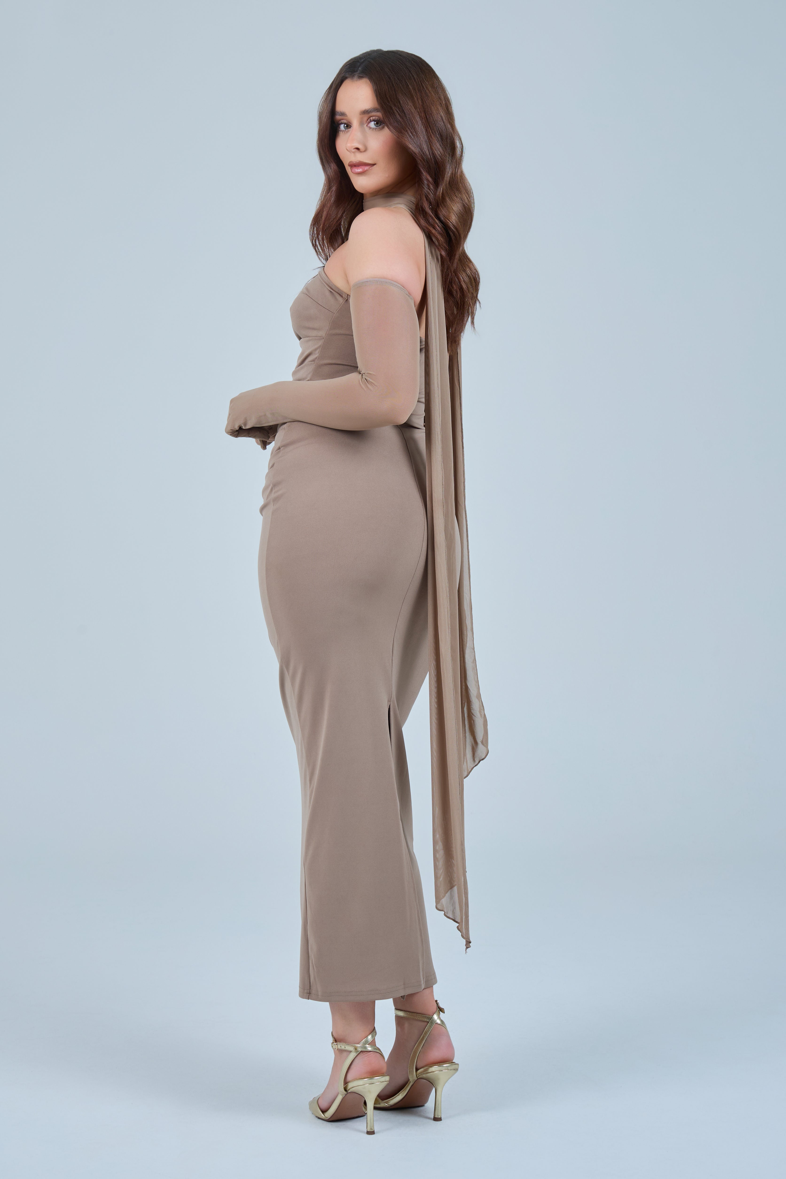 Sheer detachable-style sleeves add a contemporary edge, while the coordinating scarf detail drapes gracefully down the back, creating fluid movement and an understated statement from every angle. The fitted bodice transitions seamlessly into a straight-cut maxi skirt, elongating the figure for a flattering, streamlined appearance.