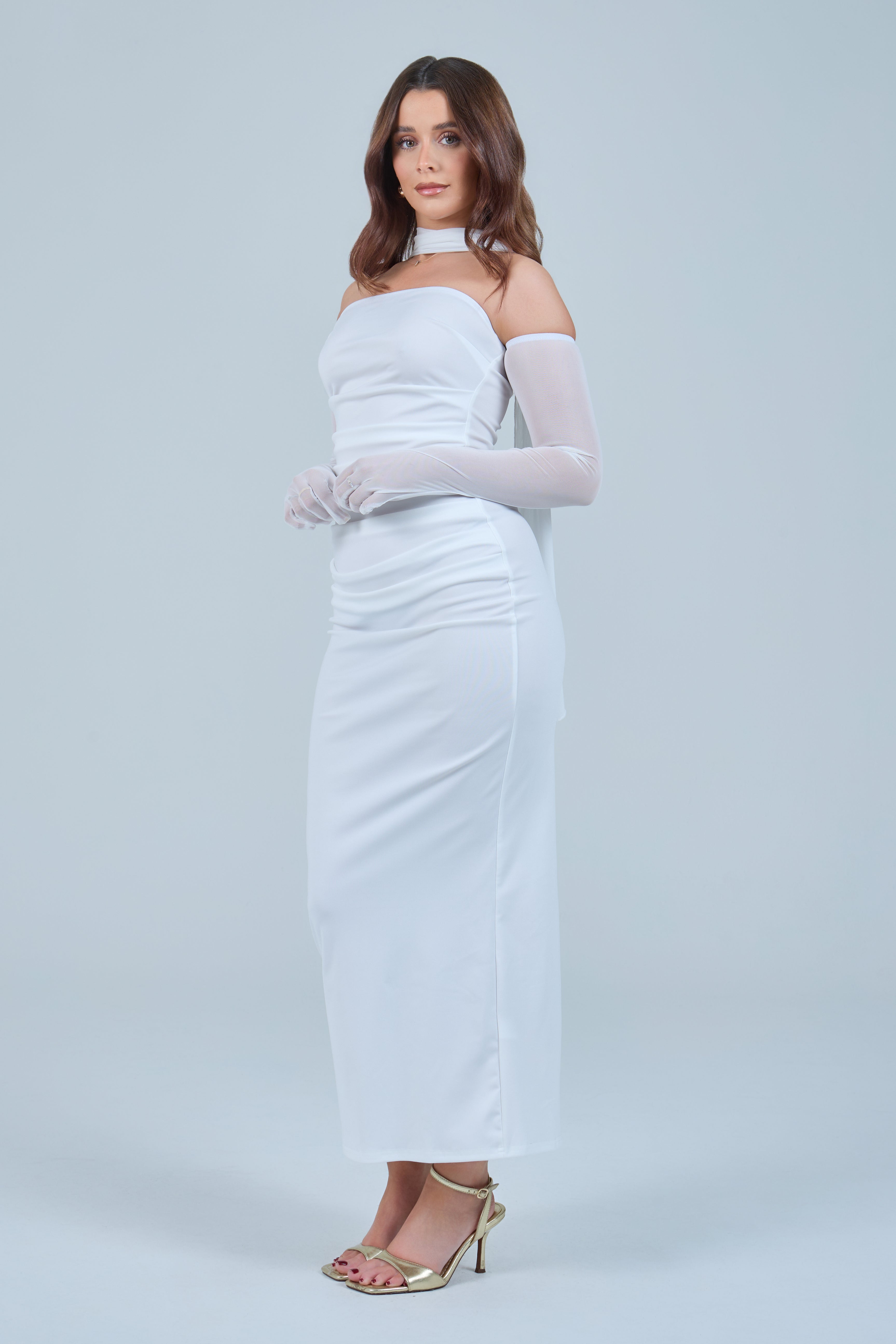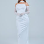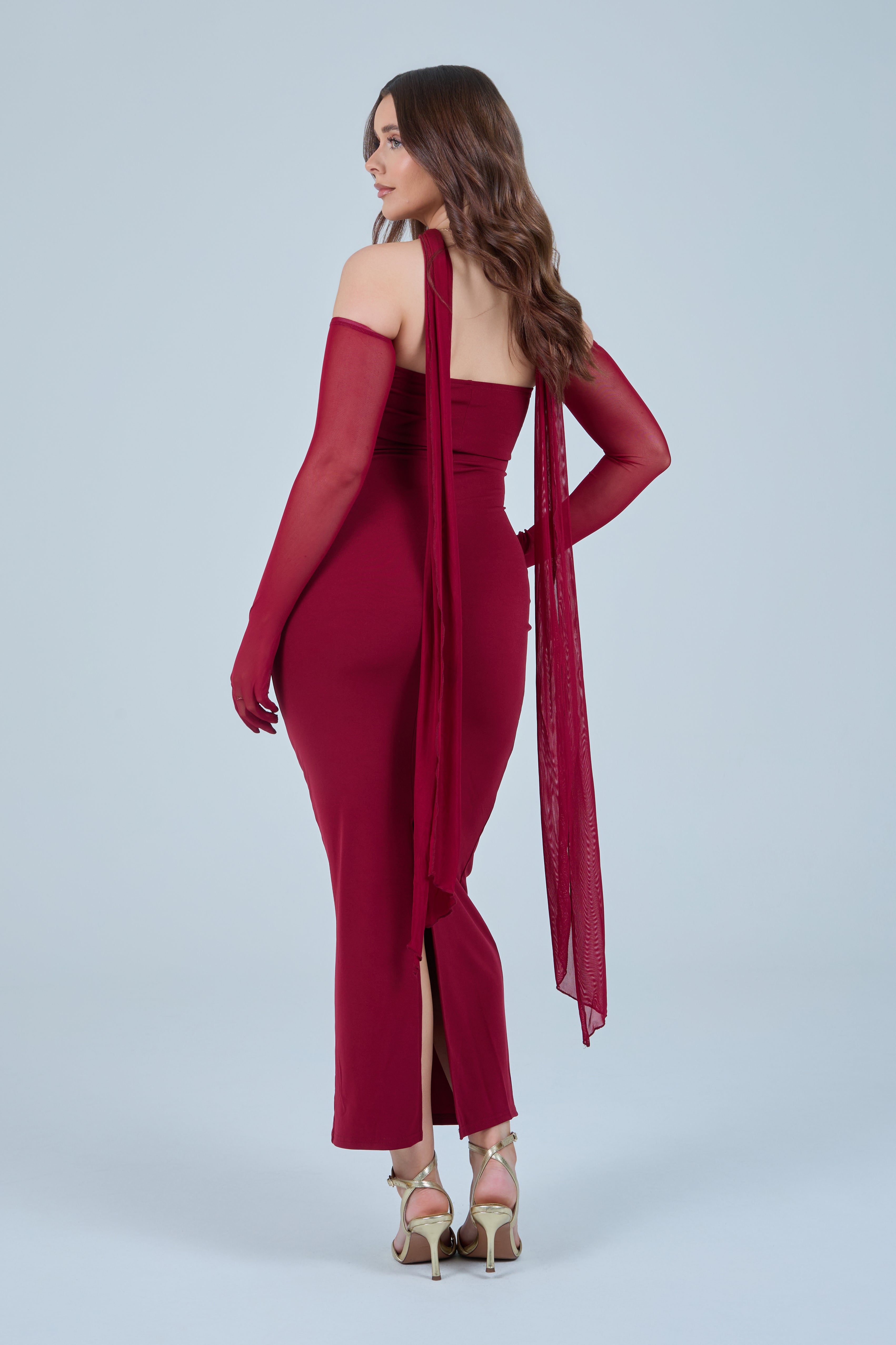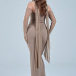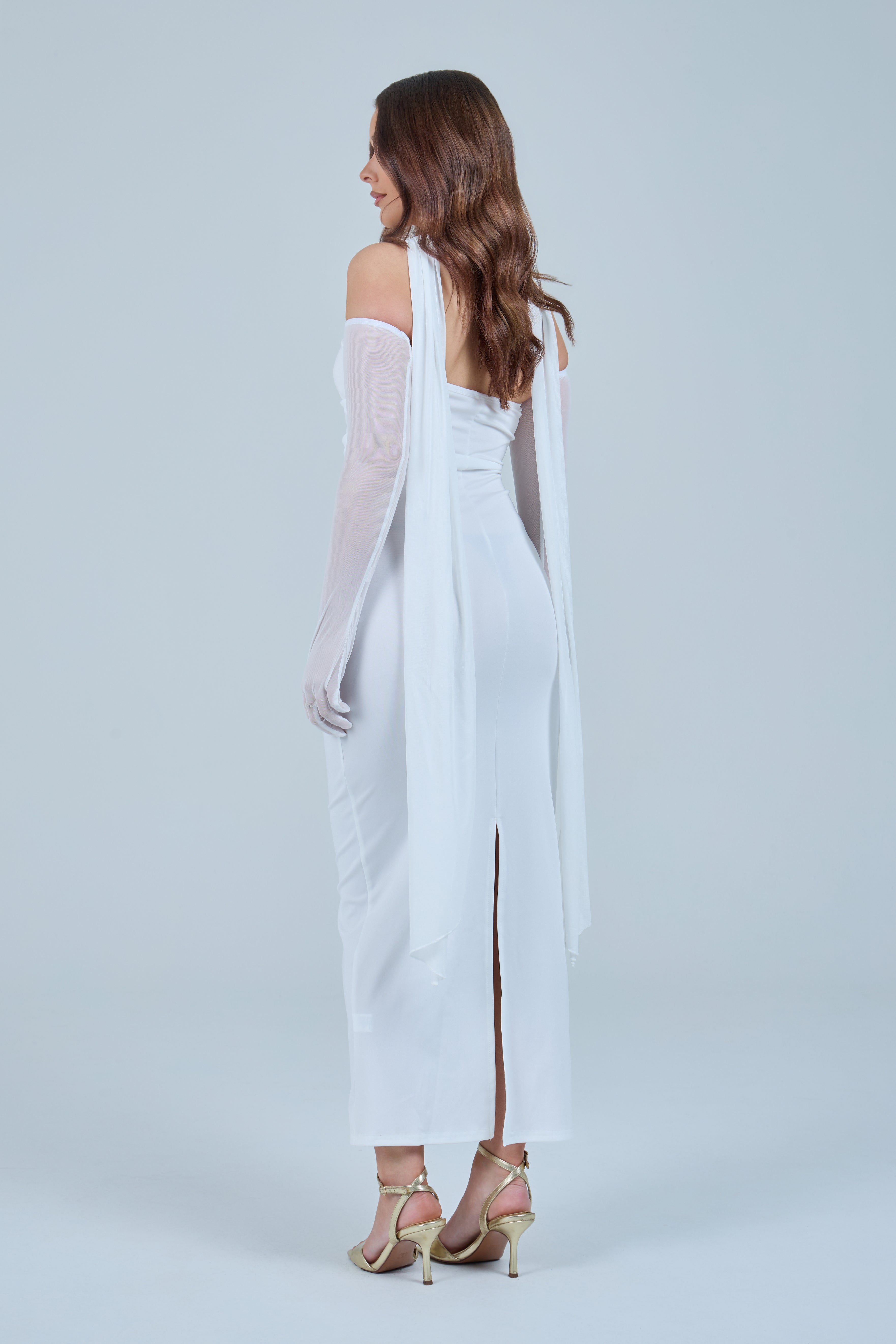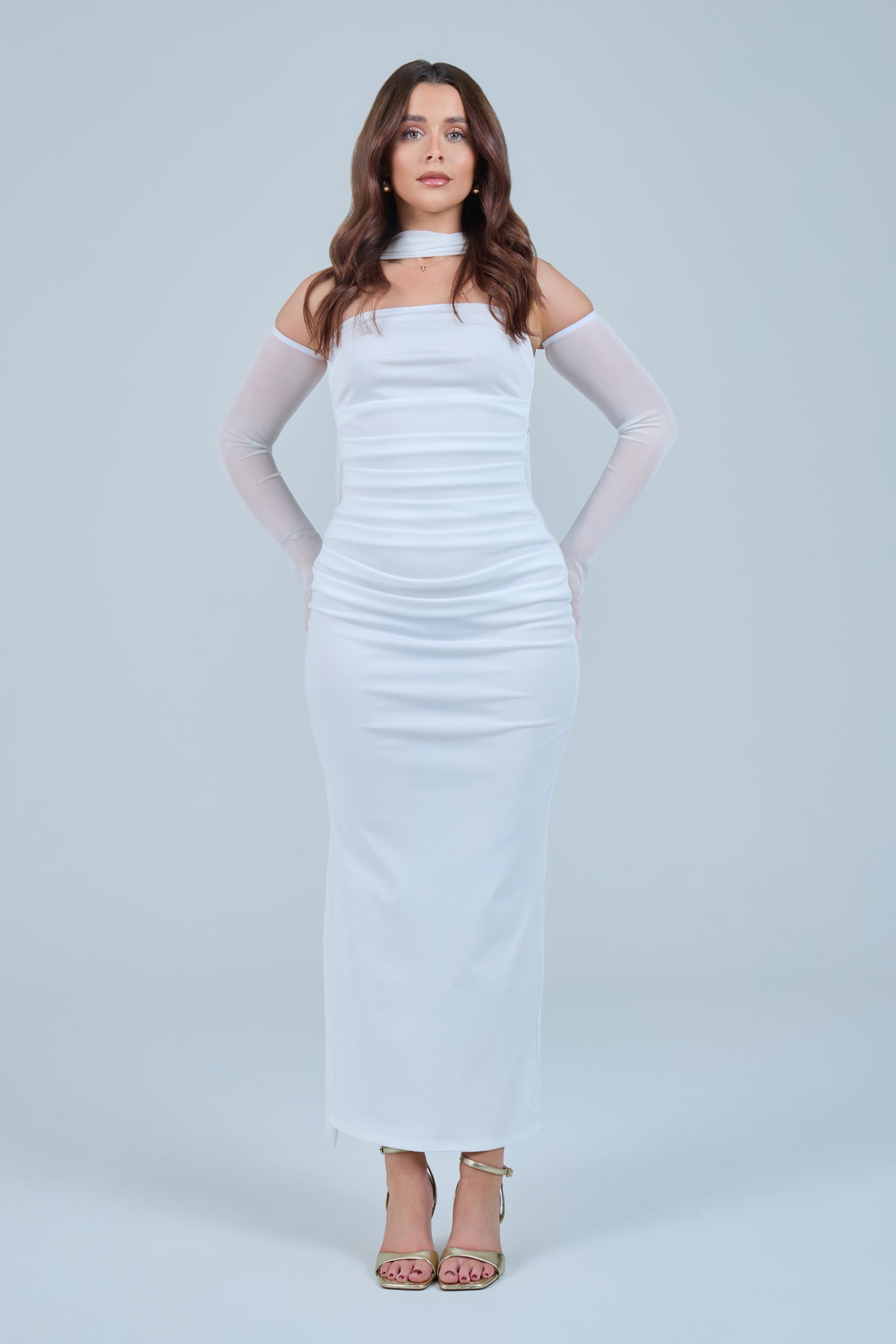 Sheer detachable-style sleeves add a contemporary edge, while the coordinating scarf detail drapes gracefully down the back, creating fluid movement and an understated statement from every angle. The fitted bodice transitions seamlessly into a straight-cut maxi skirt, elongating the figure for a flattering, streamlined appearance.