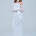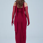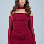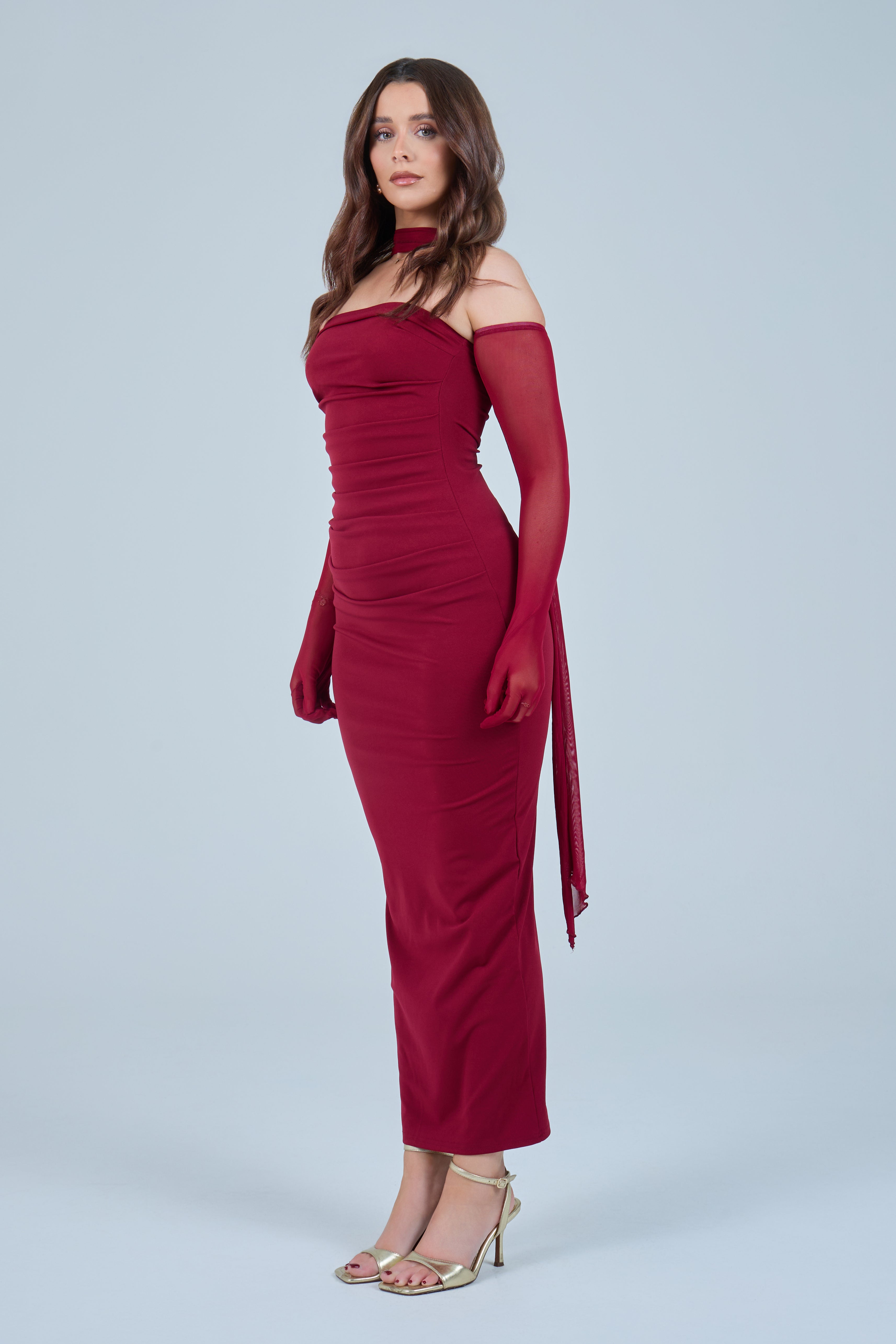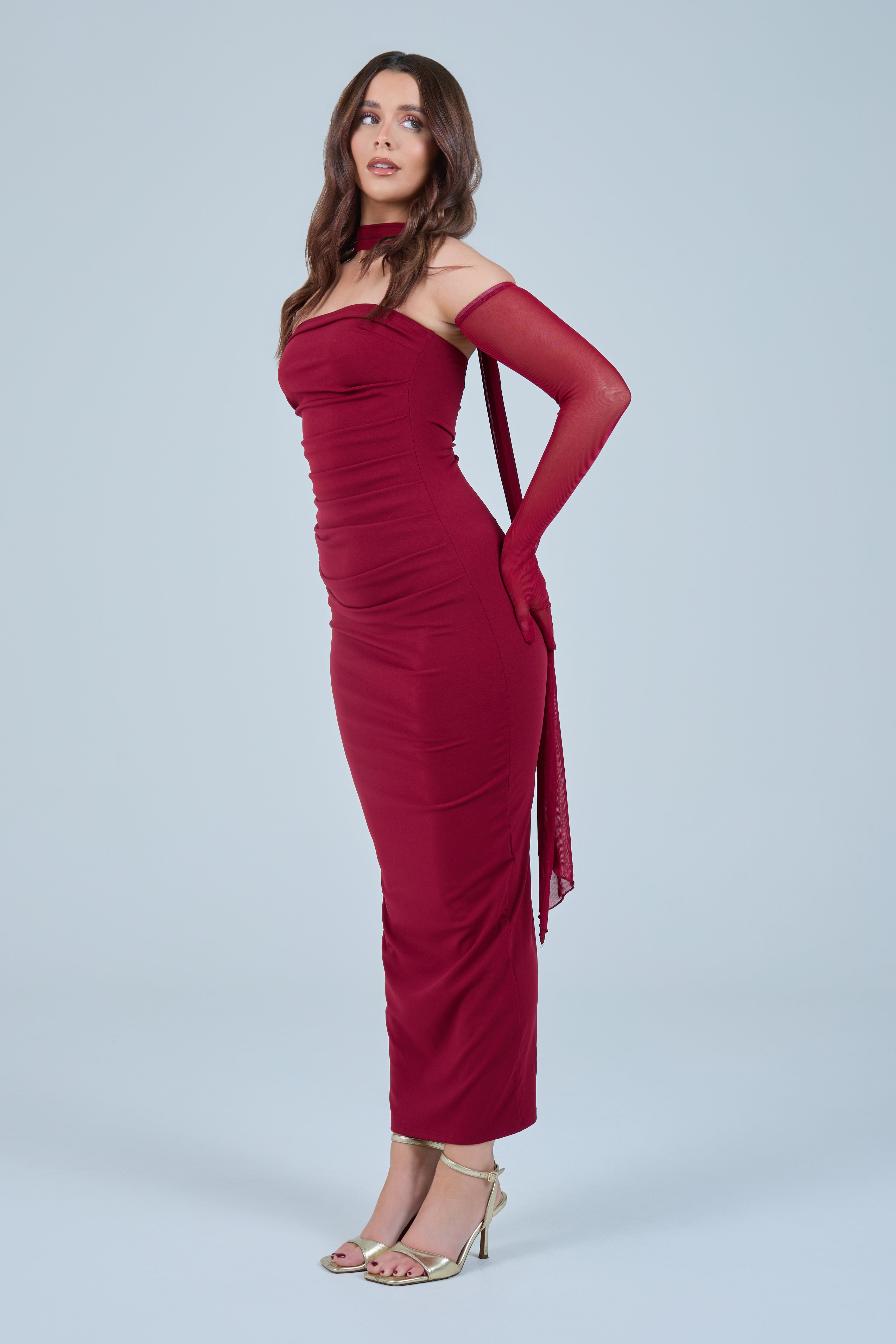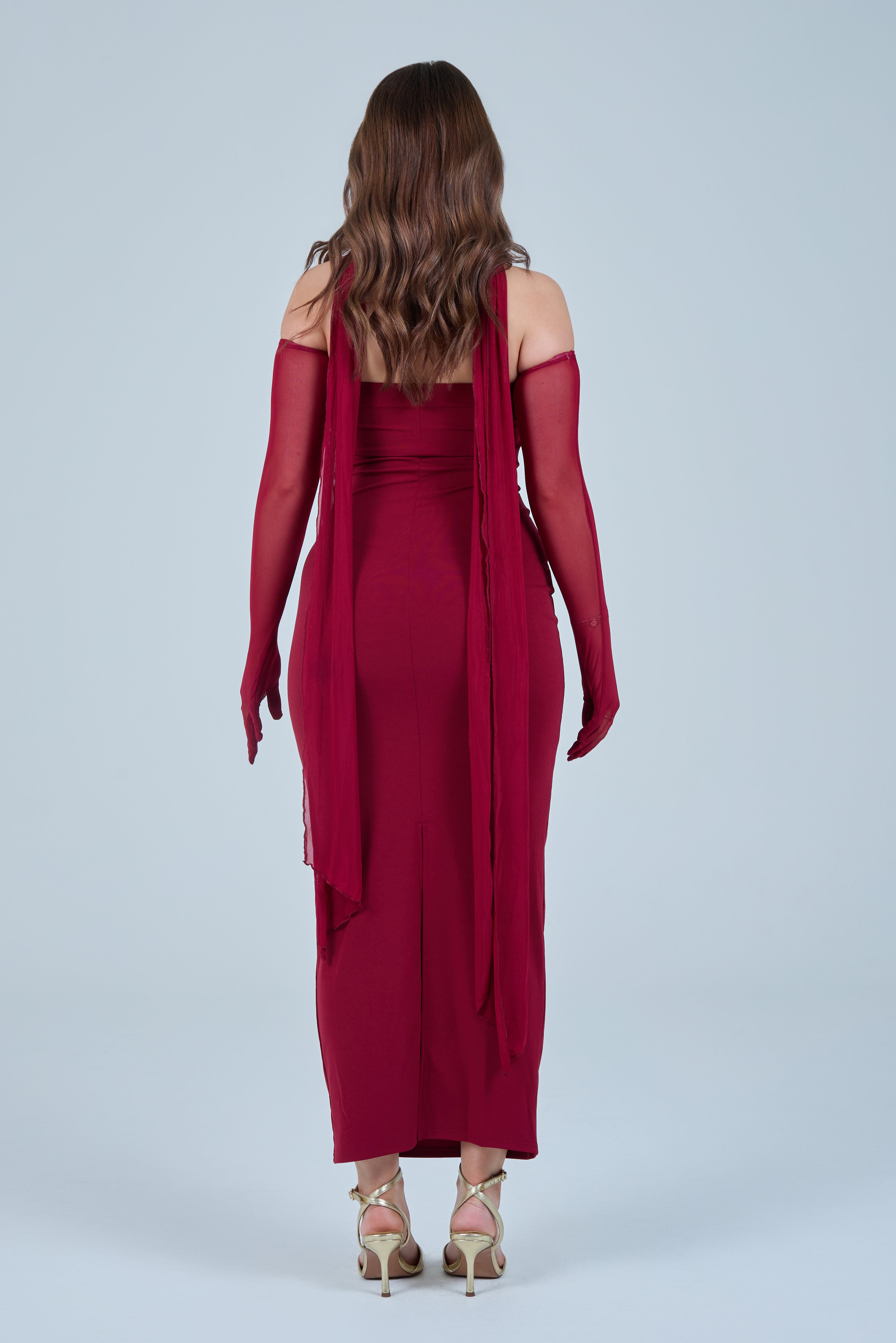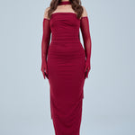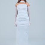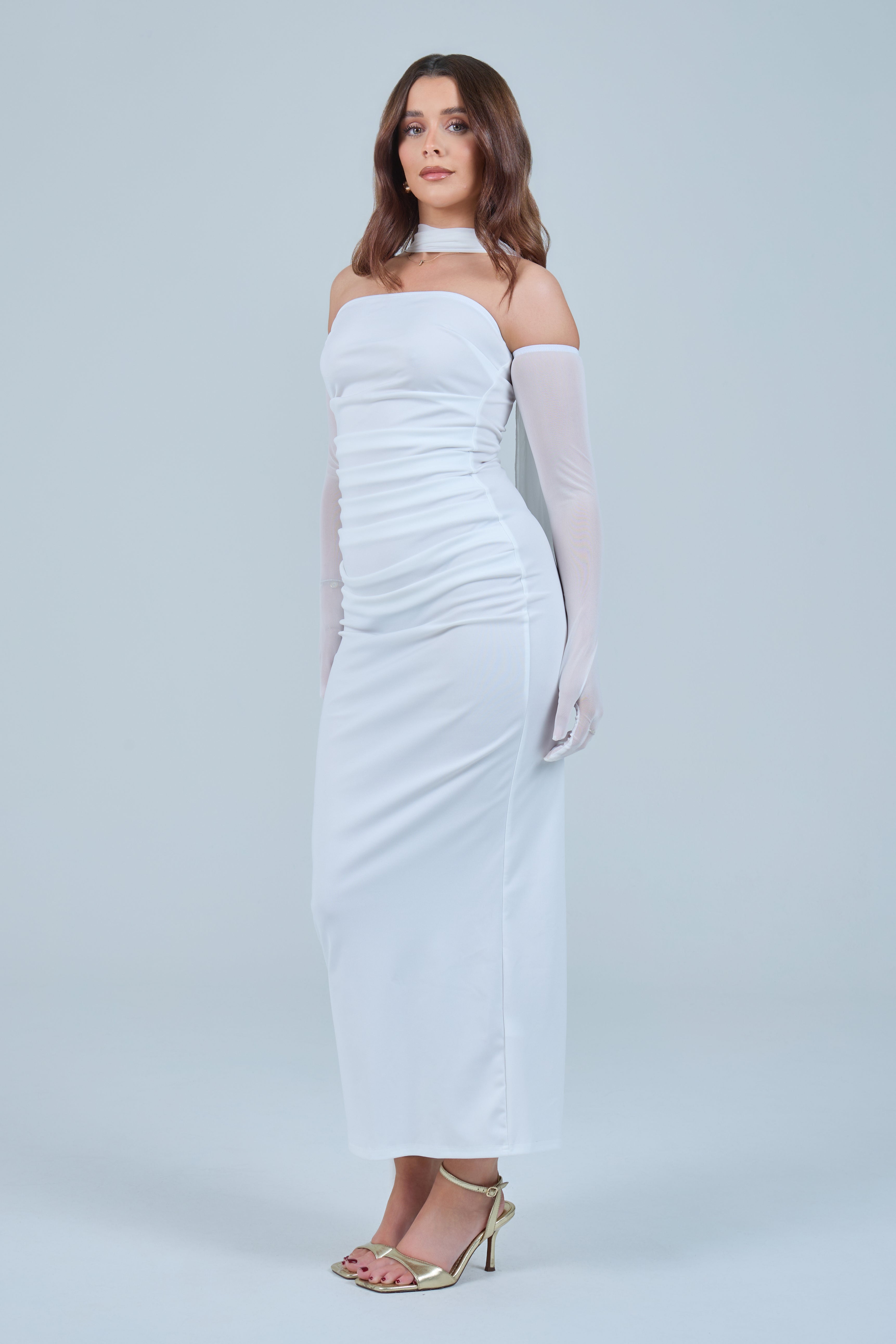 Sheer detachable-style sleeves add a contemporary edge, while the coordinating scarf detail drapes gracefully down the back, creating fluid movement and an understated statement from every angle. The fitted bodice transitions seamlessly into a straight-cut maxi skirt, elongating the figure for a flattering, streamlined appearance.