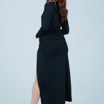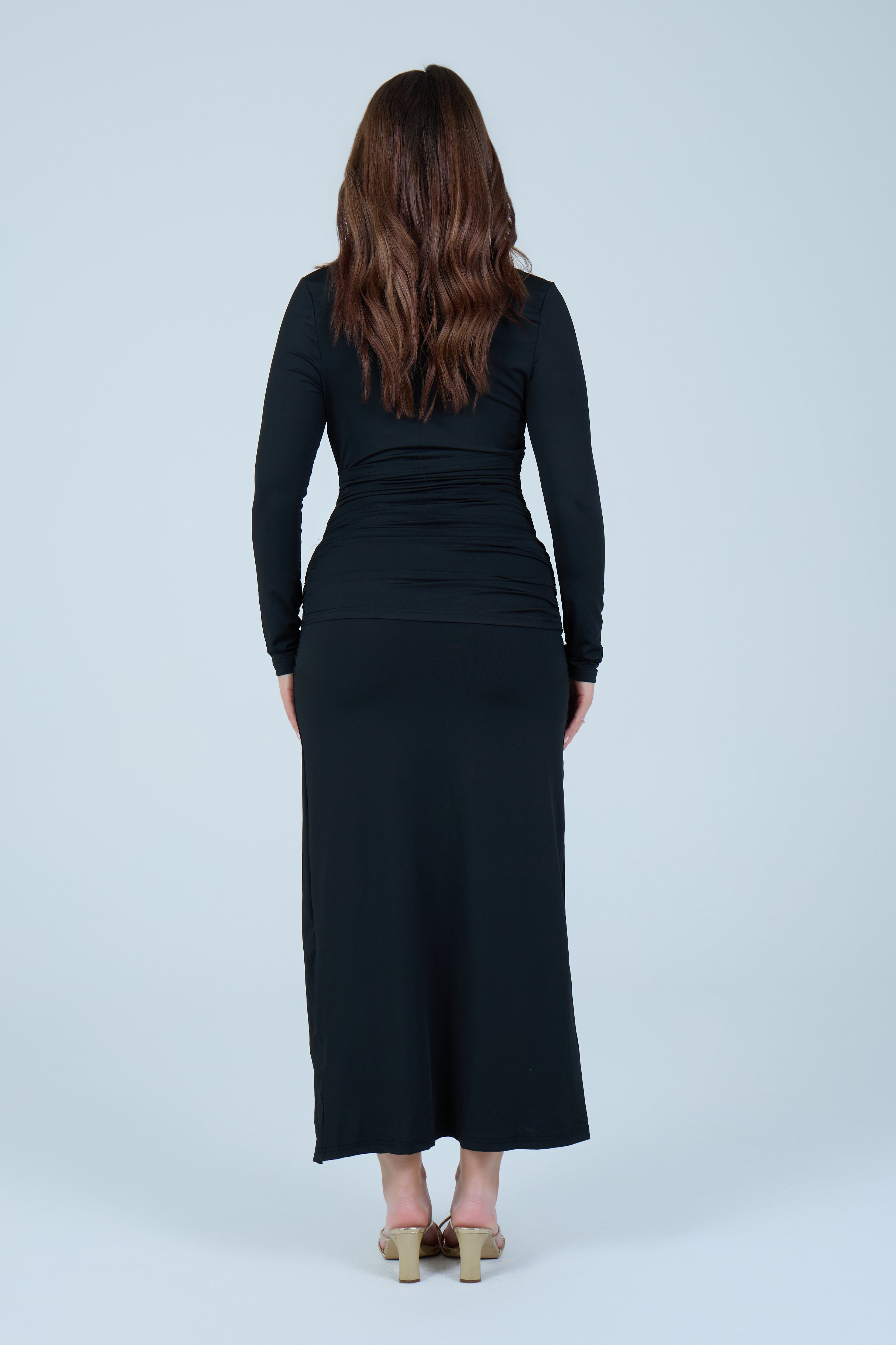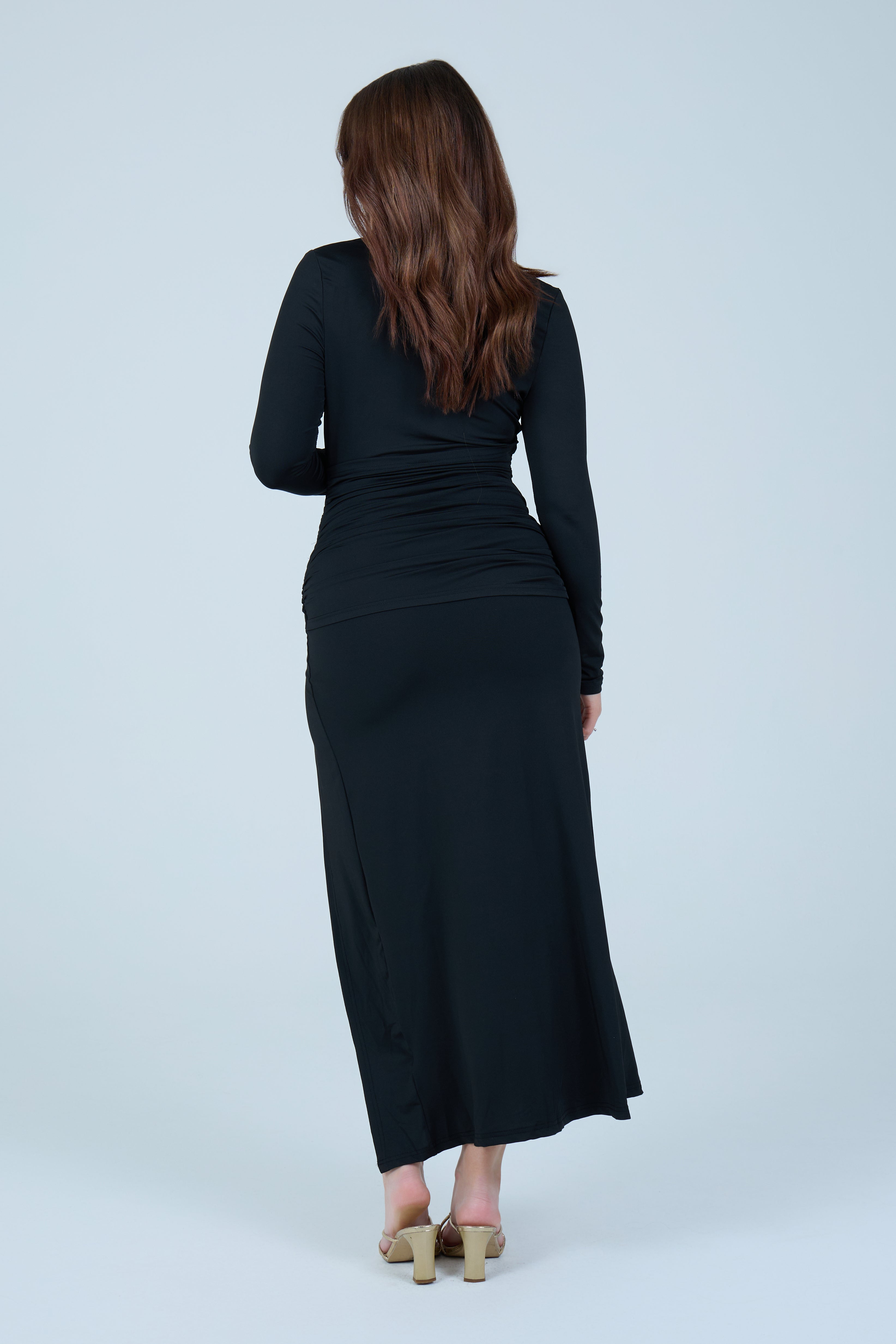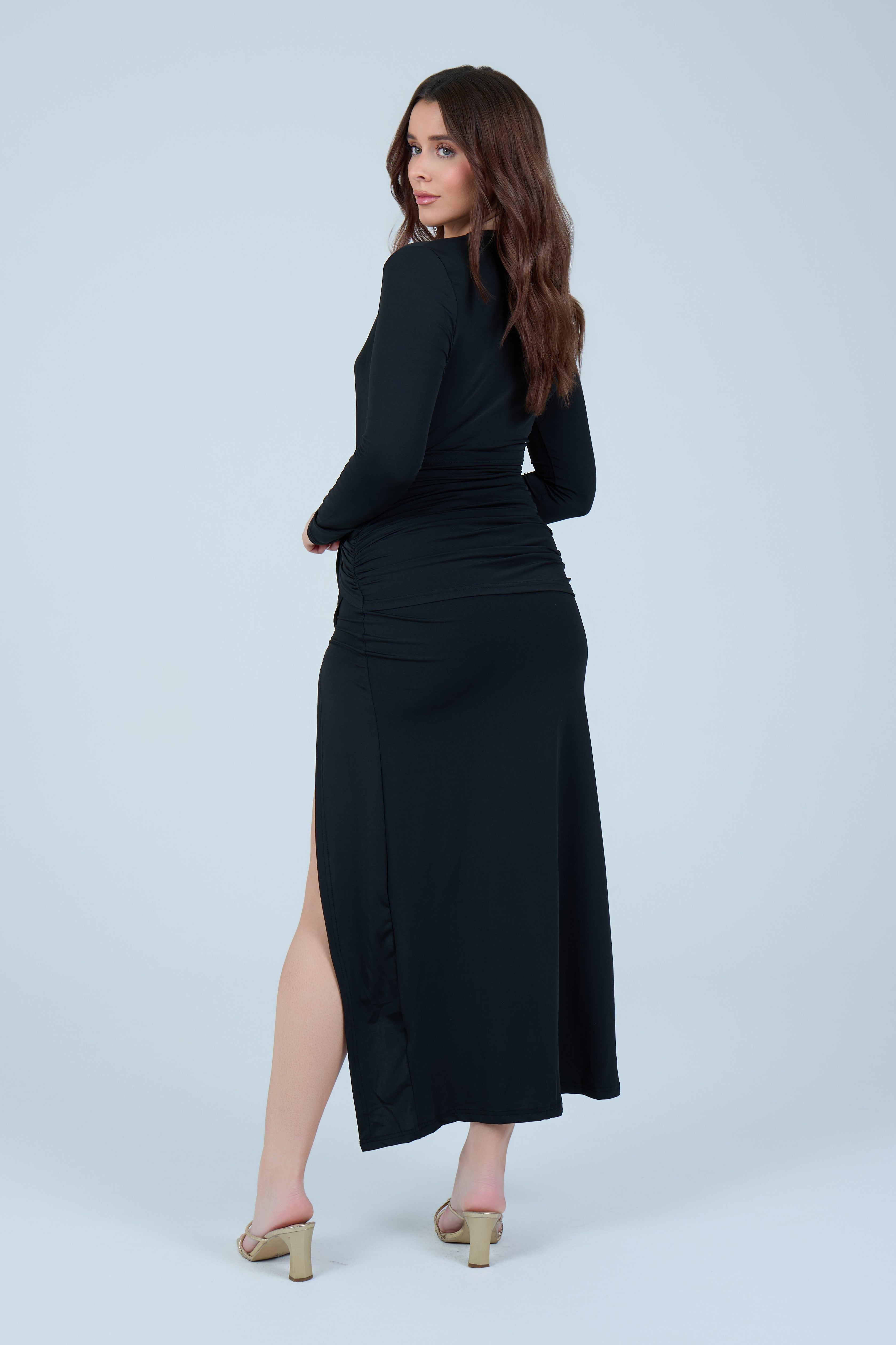 Soft ruching at the waist draws the eye inward, accentuating the waistline and enhancing the body’s natural curves. A high thigh slit adds movement and allure, making this dress perfect for evening occasions, formal events, or elevated nights out. The floor-length skirt flows smoothly, offering a flattering and comfortable fit with a sleek finish.
