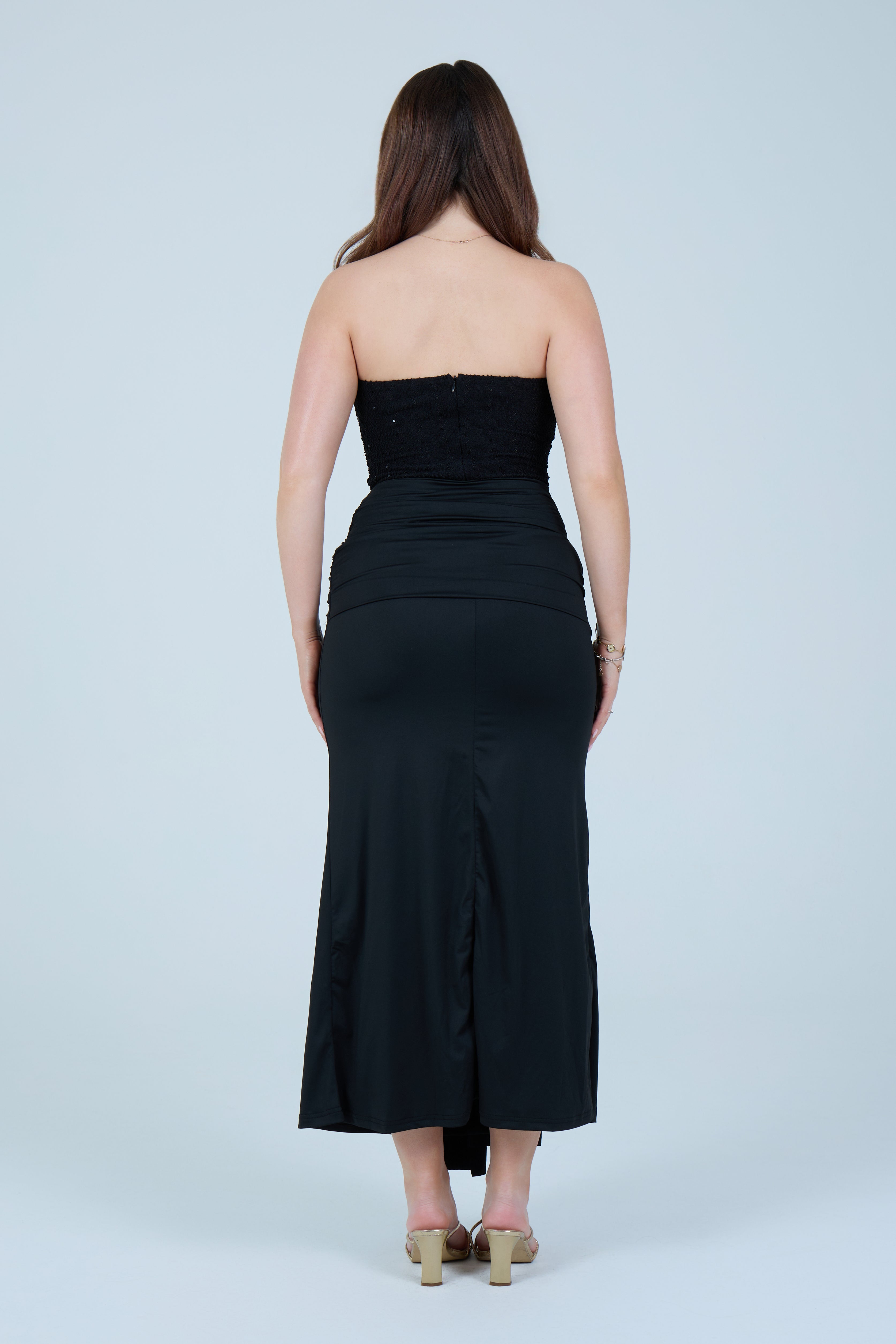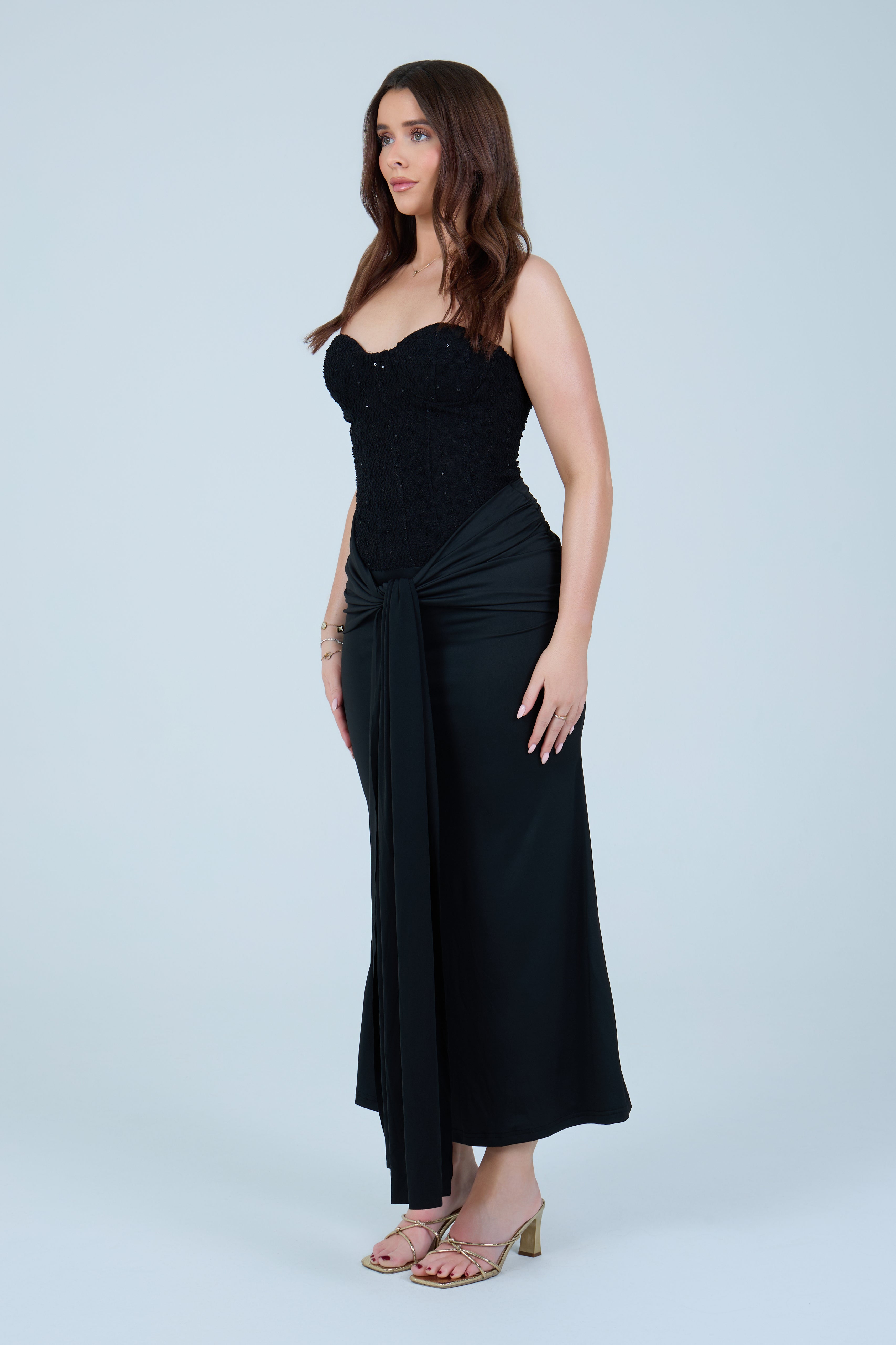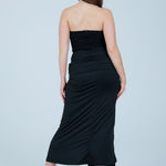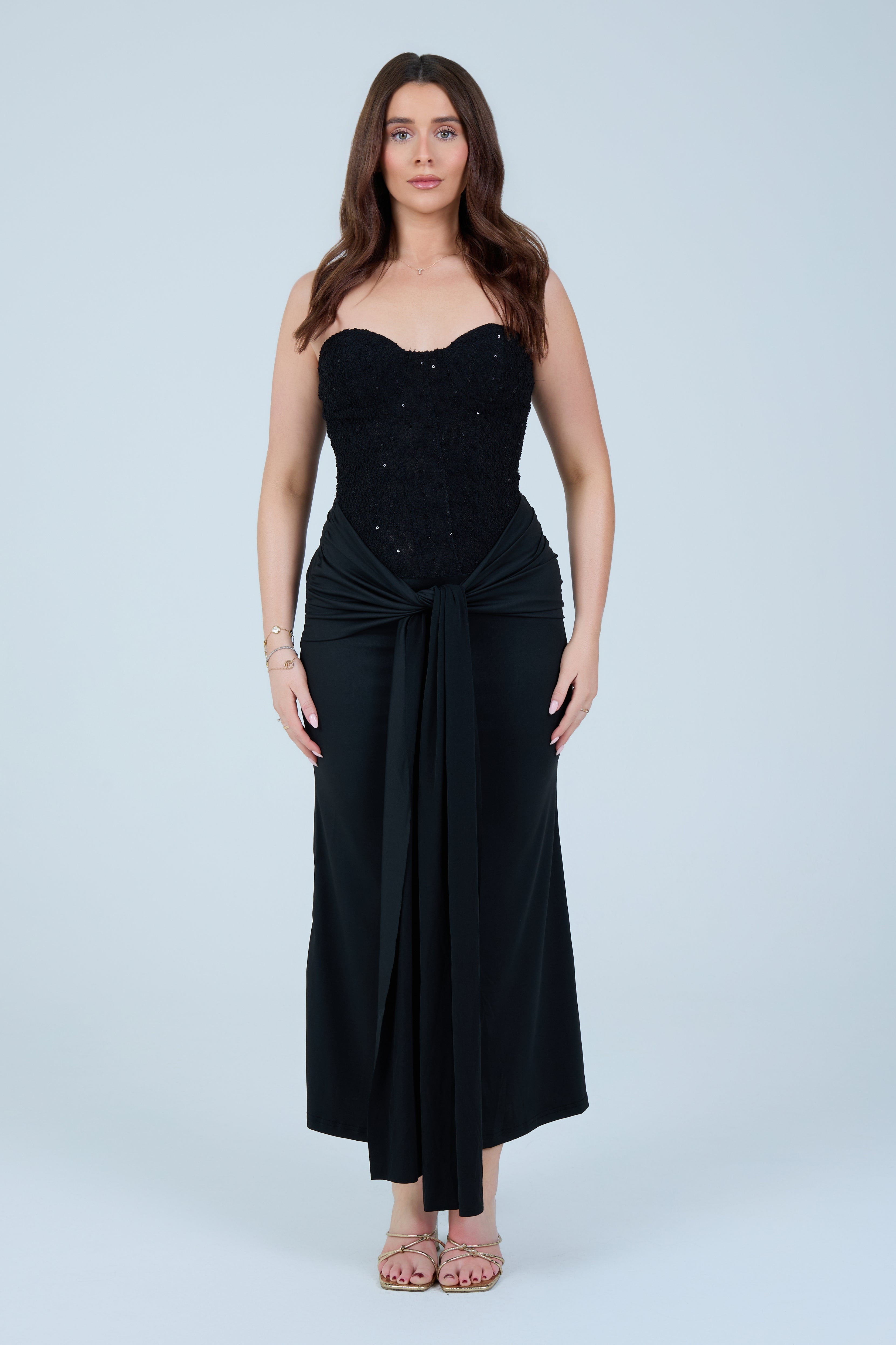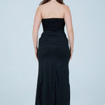 This elegant black strapless maxi dress is designed to flatter the figure with a structured, sculpting bodice and a softly draped skirt. The strapless corset-style top features subtle embellishment detailing, offering a refined, evening-ready finish while providing support and shape through the waist. The skirt flows effortlessly to a midi–maxi length and is accented with a gathered front tie detail that enhances movement and adds a modern, feminine touch.
