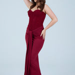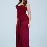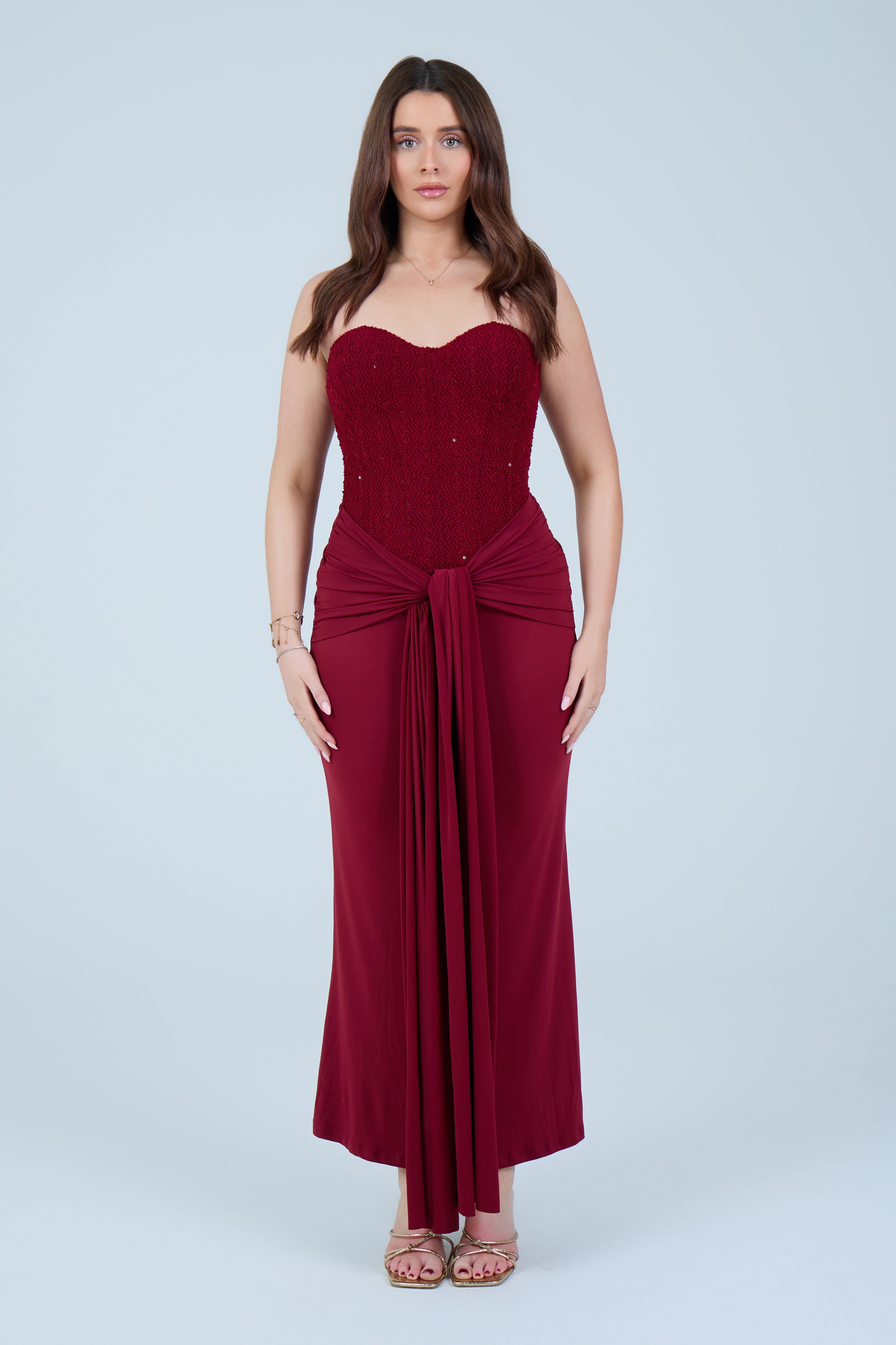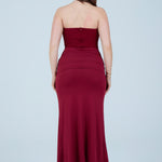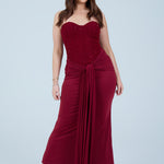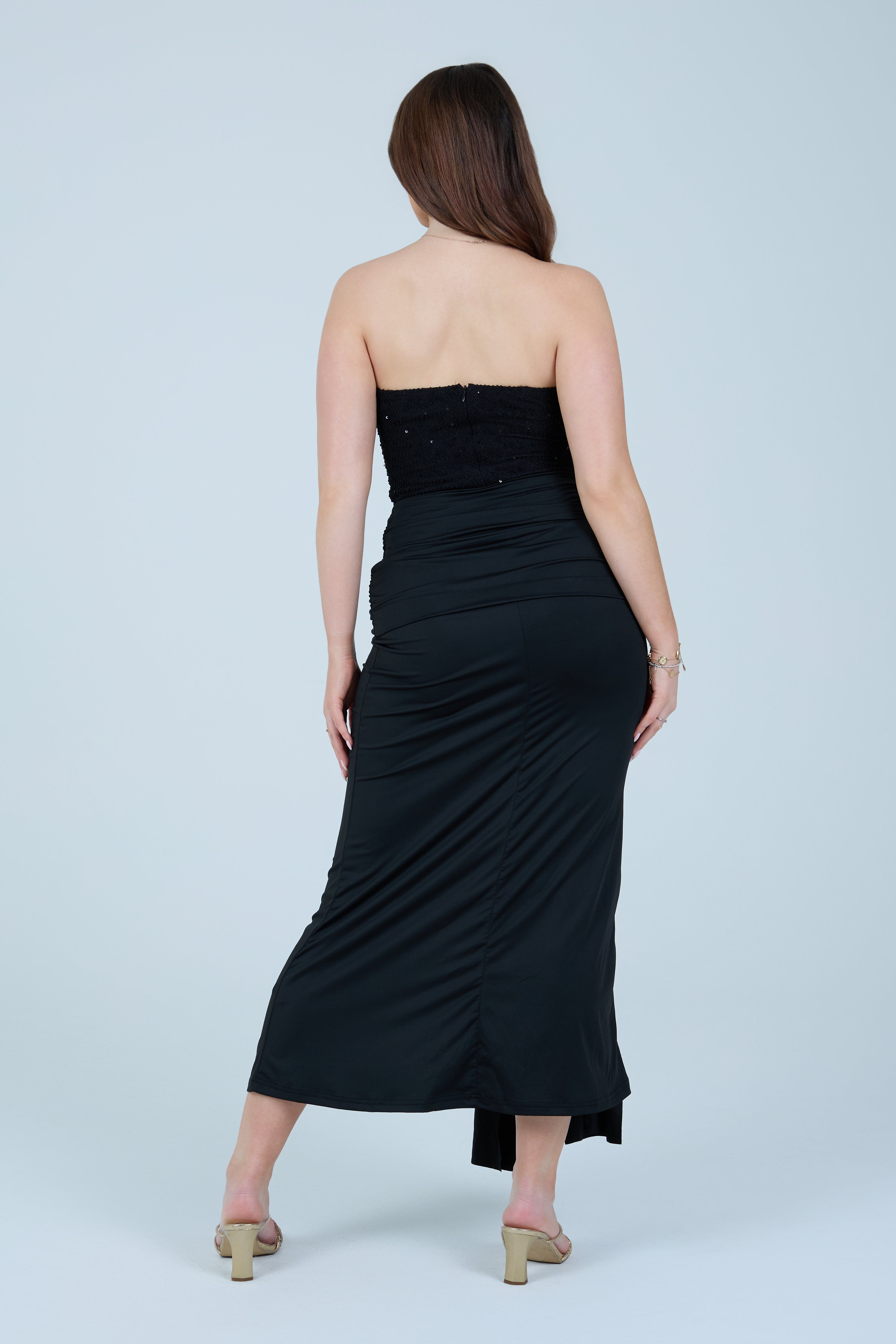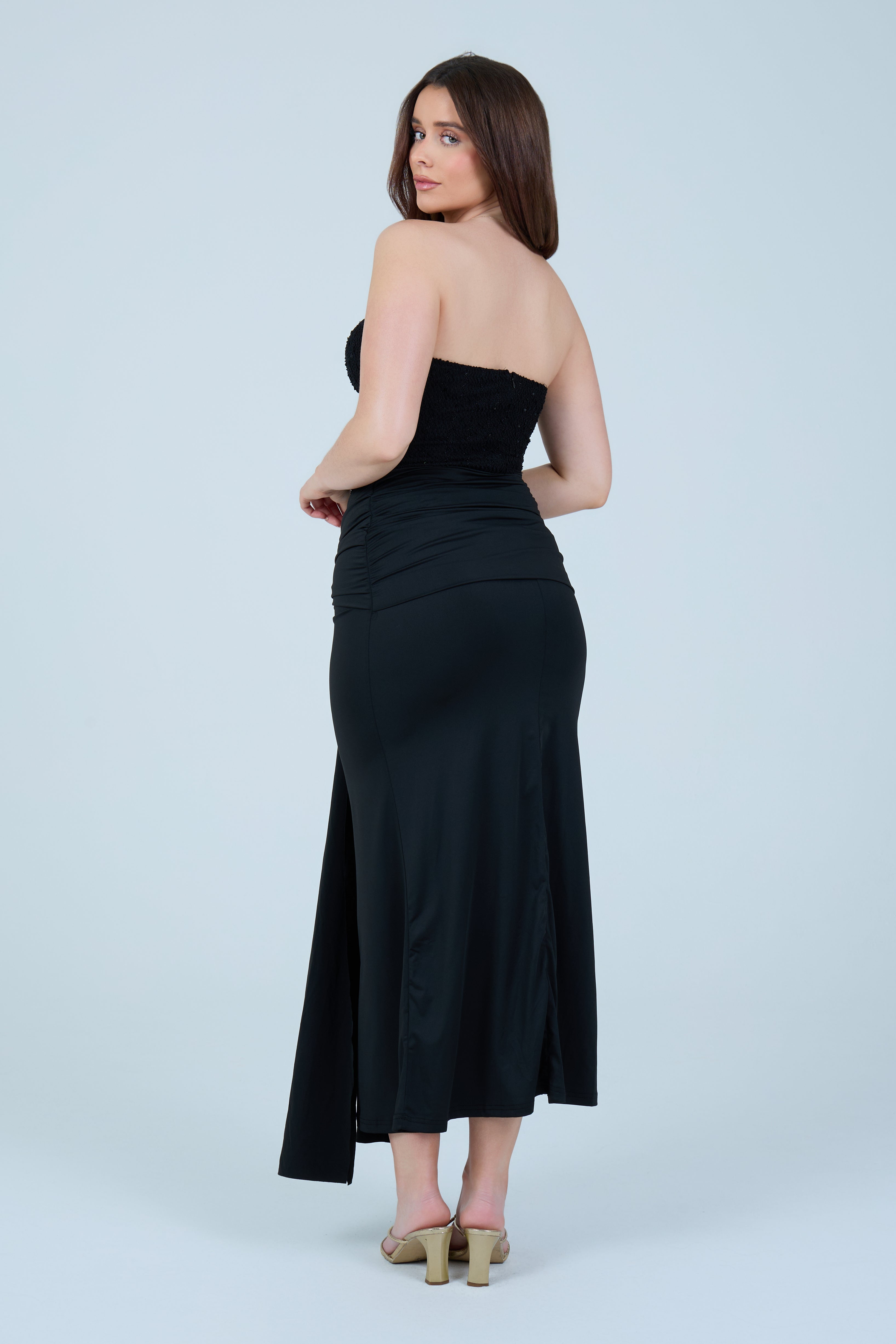 This elegant black strapless maxi dress is designed to flatter the figure with a structured, sculpting bodice and a softly draped skirt. The strapless corset-style top features subtle embellishment detailing, offering a refined, evening-ready finish while providing support and shape through the waist. The skirt flows effortlessly to a midi–maxi length and is accented with a gathered front tie detail that enhances movement and adds a modern, feminine touch.