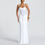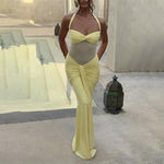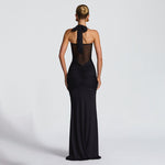 Elegant Design: Features a stylish halter neckline with delicate mesh and flowing ribbon details, perfect for formal occasions.