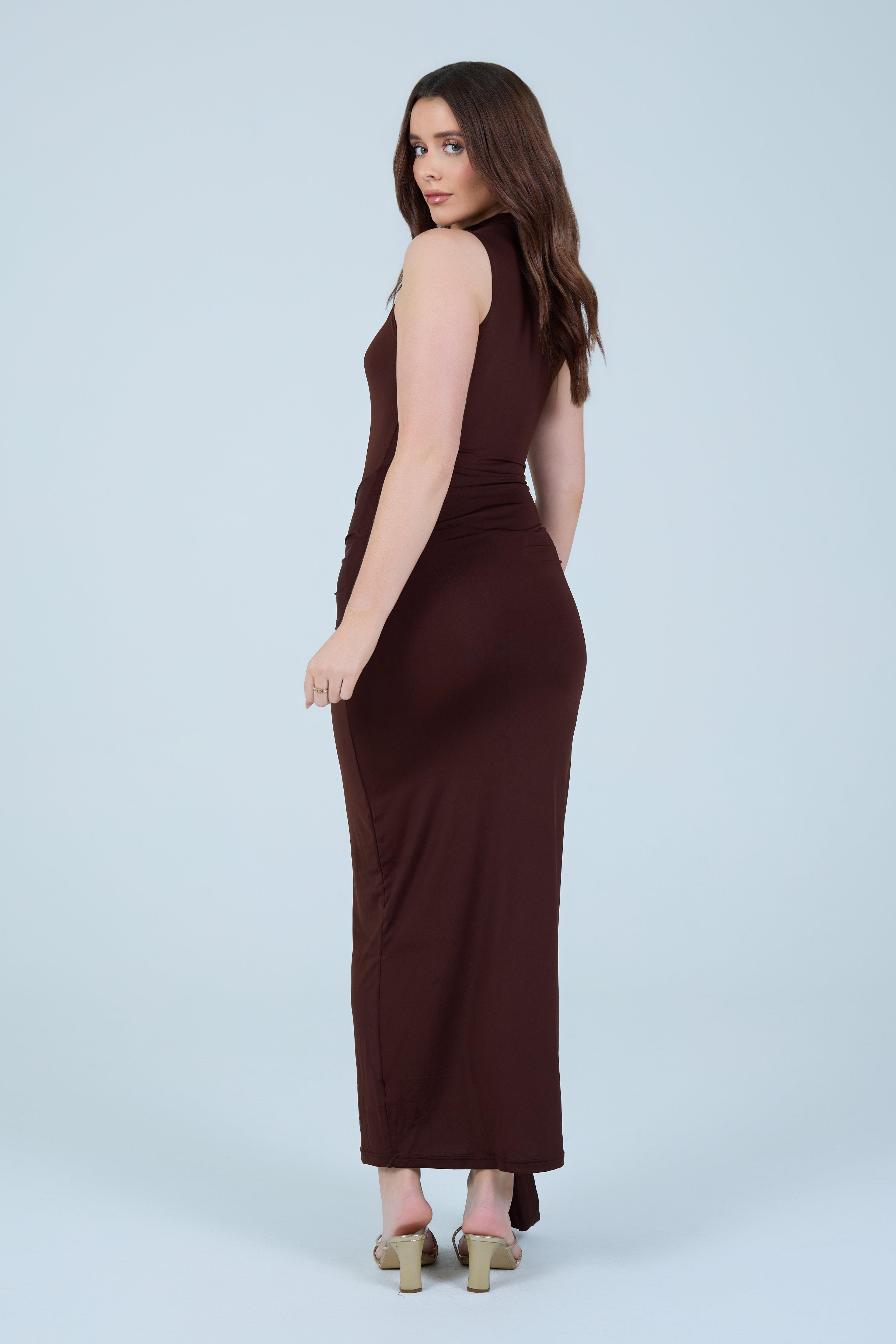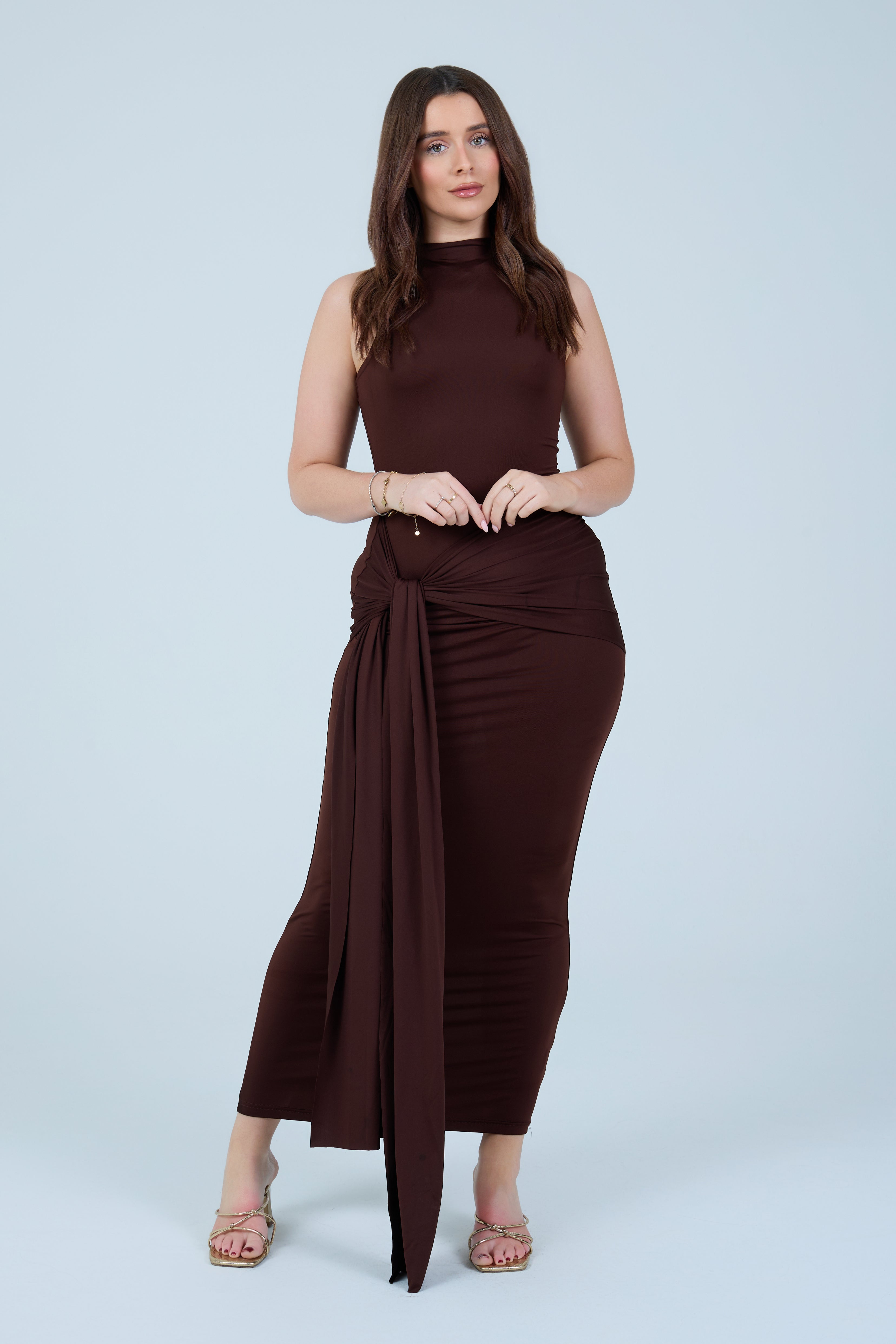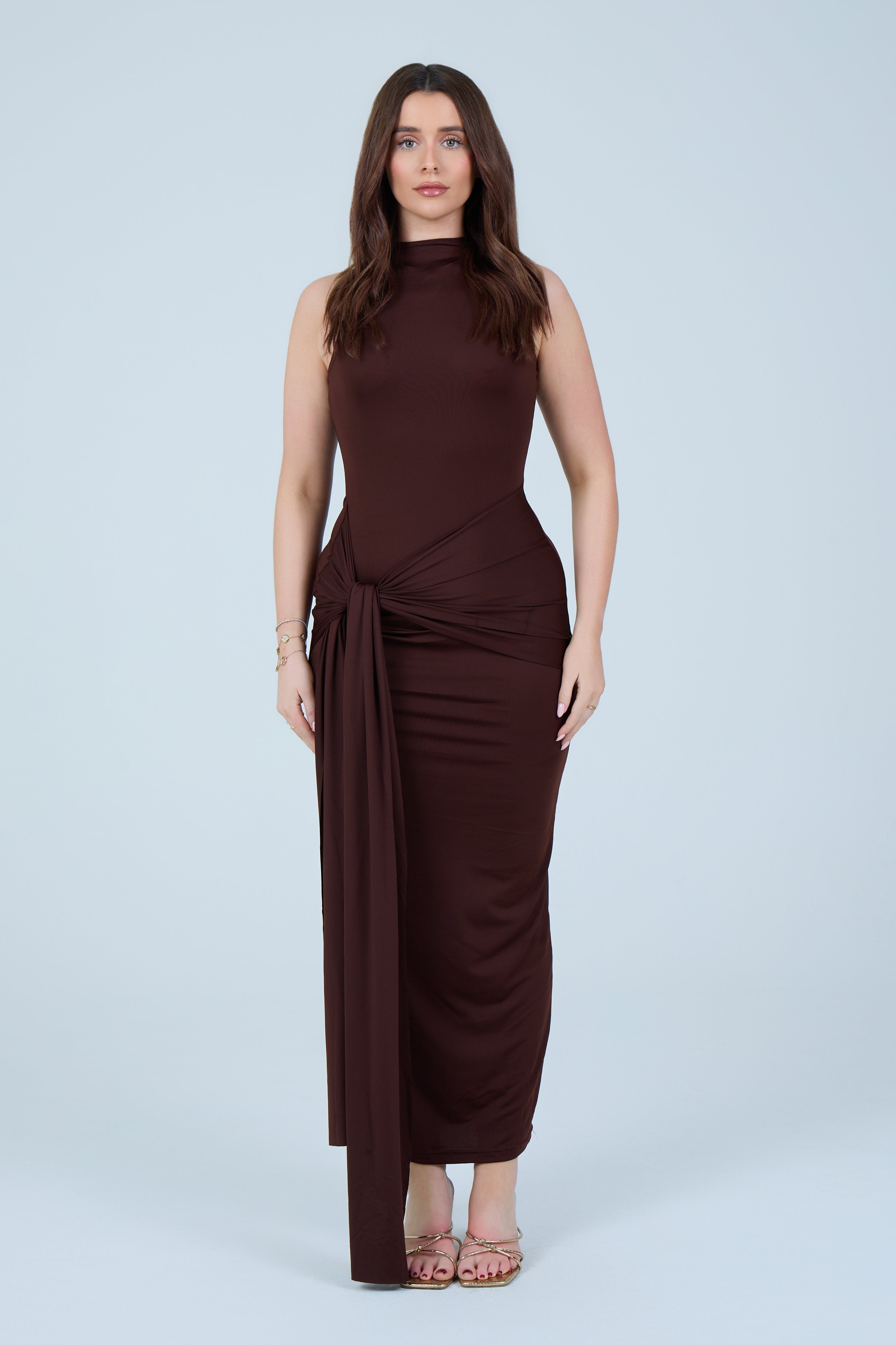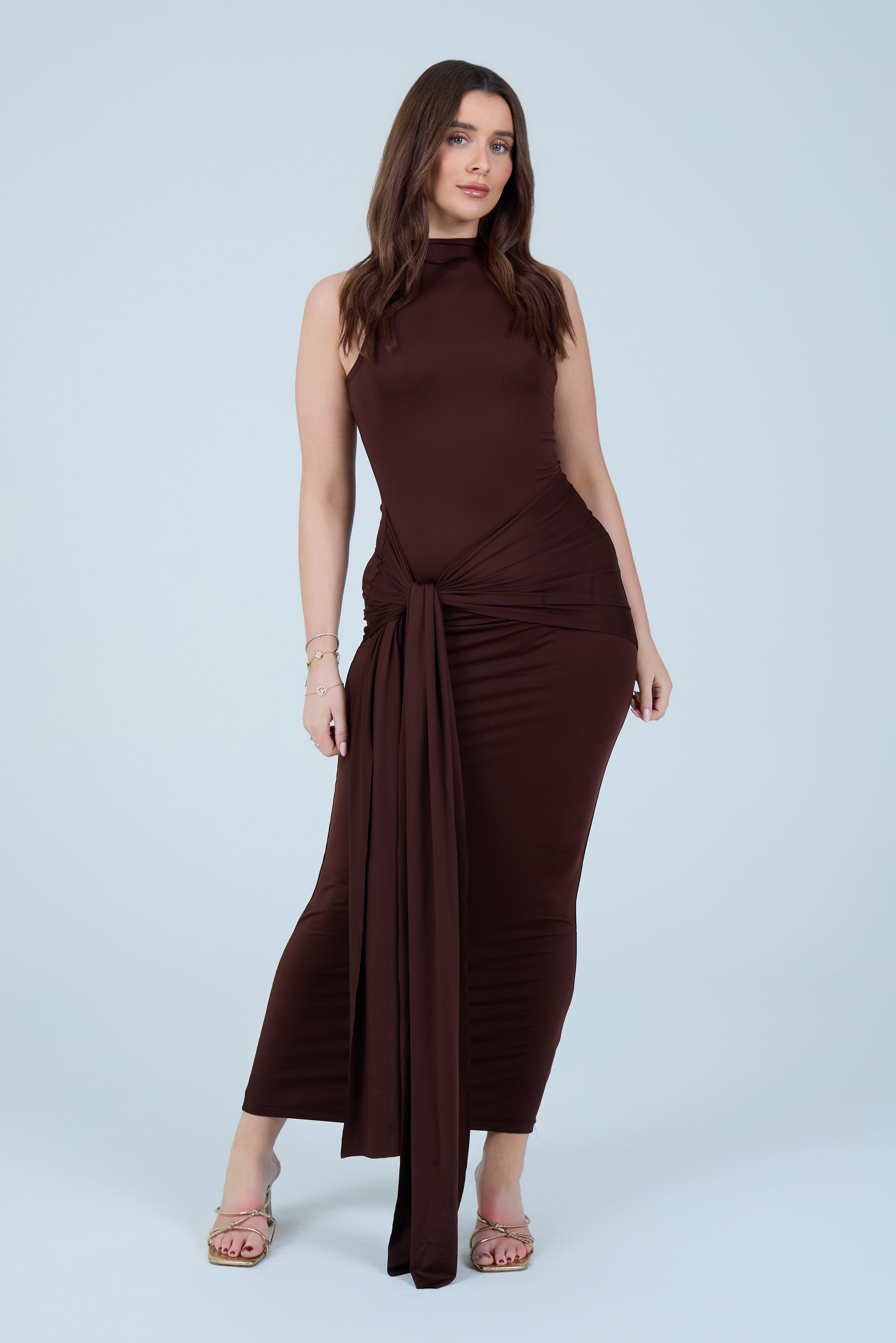 Make an elegant statement with this sleek chocolate-brown maxi dress, designed to flatter the silhouette with refined simplicity. Crafted from a smooth, stretch fabric, this sleeveless style features a high neckline that balances sophistication with modern appeal. The fitted bodice flows into a figure-hugging skirt, enhanced by a gathered wrap detail at the waist that creates a beautifully draped effect. A soft front tie accent adds dimension while subtly contouring the waistline, making this piece both timeless and feminine.