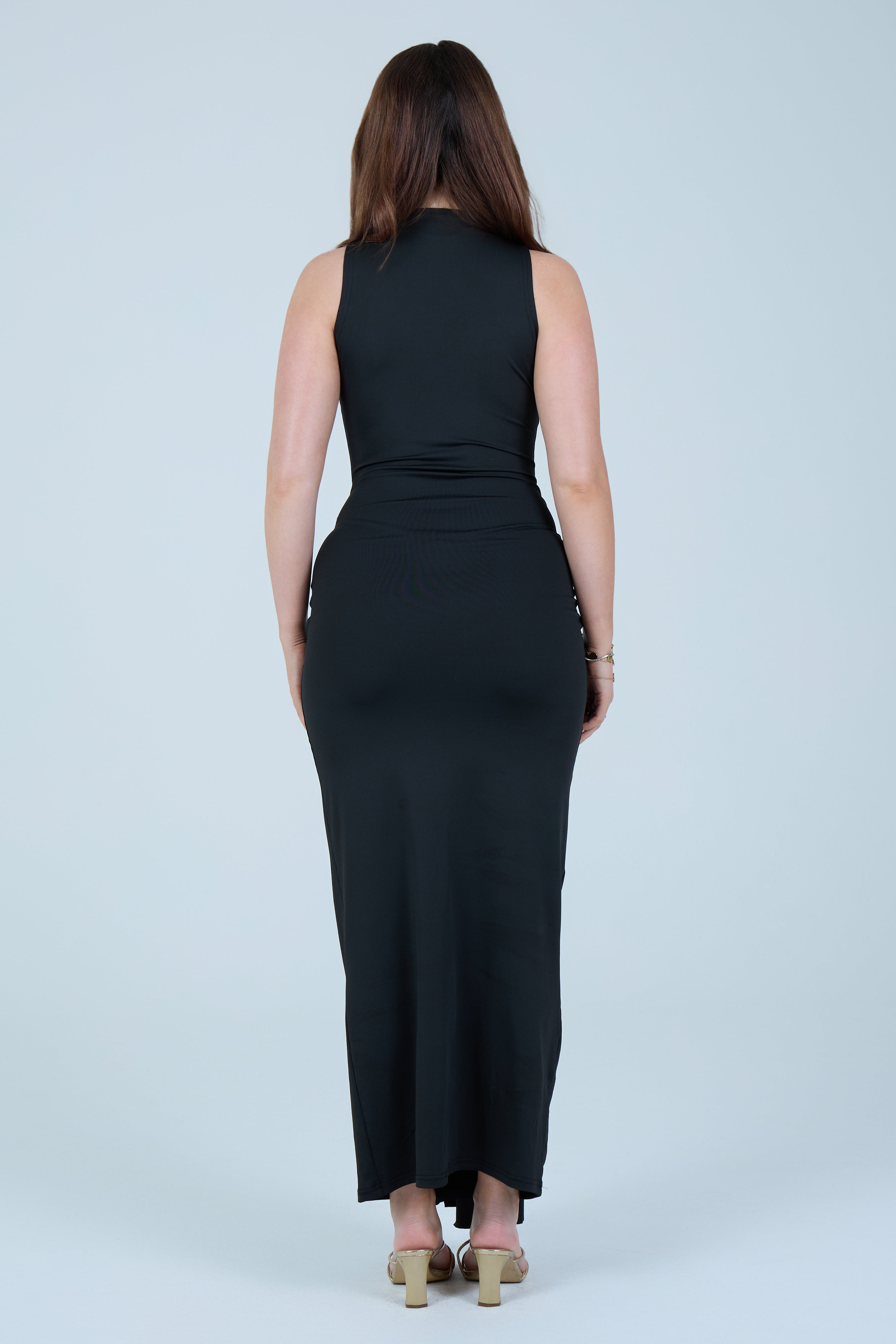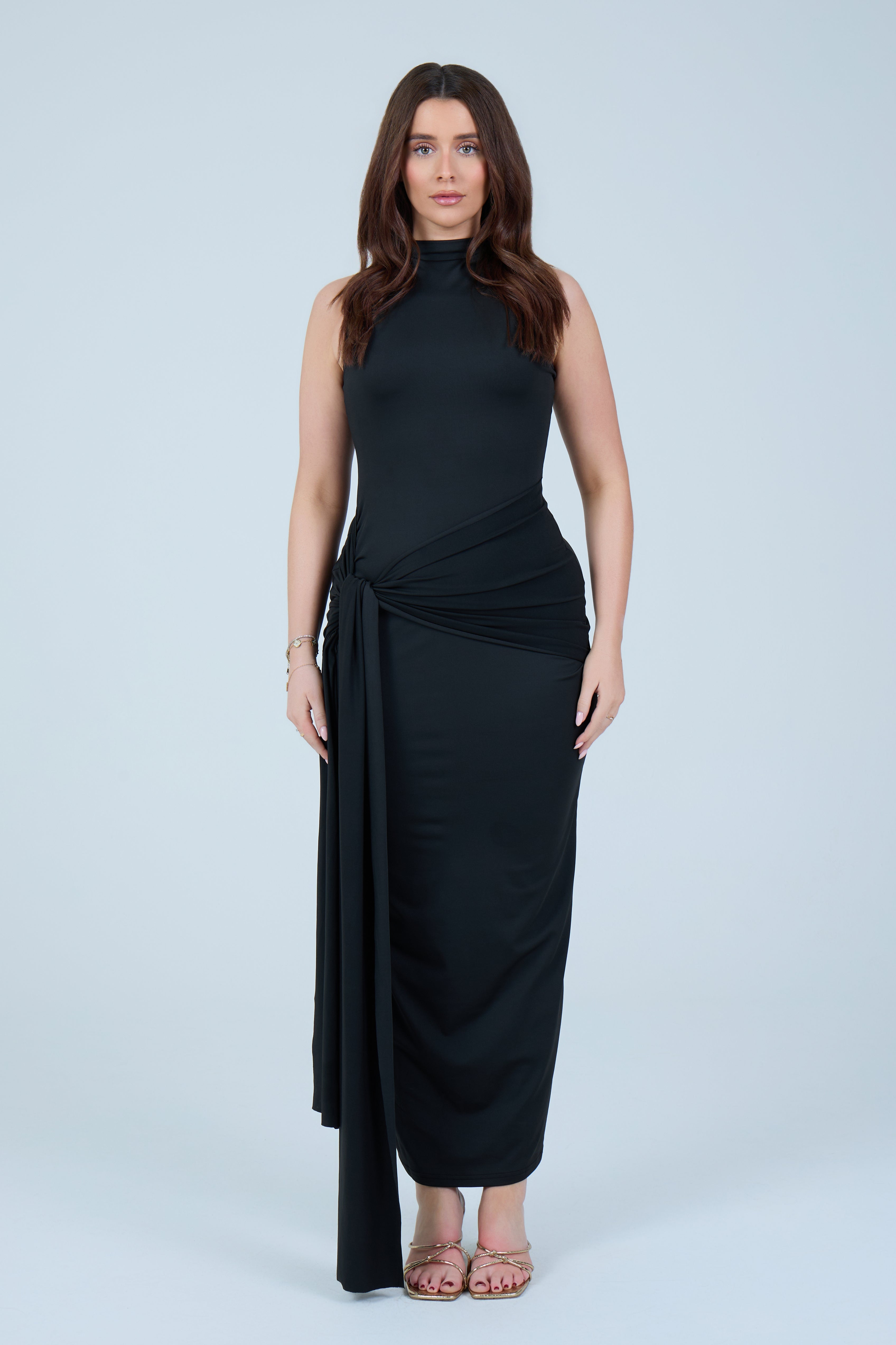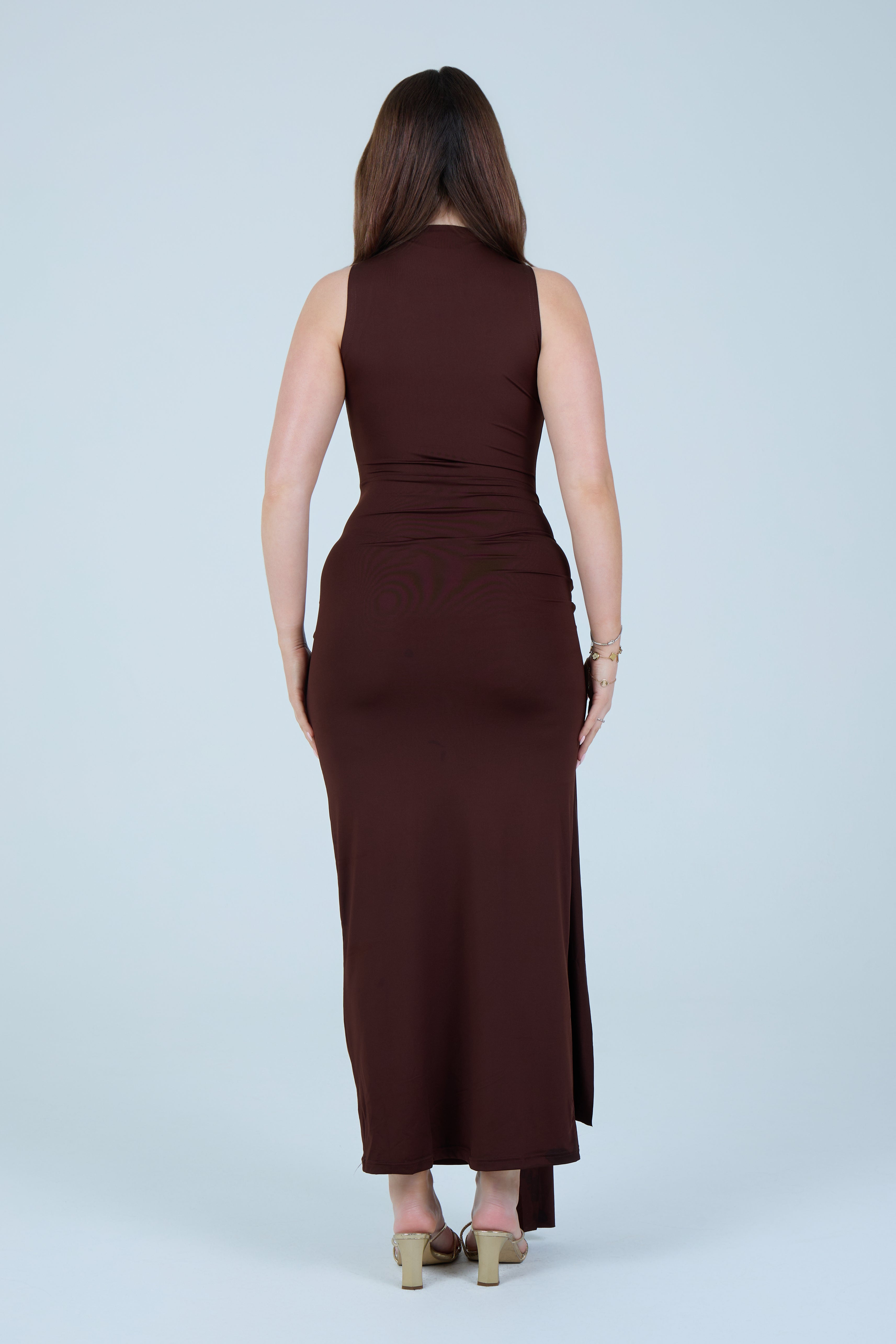 Make an elegant statement with this sleek chocolate-brown maxi dress, designed to flatter the silhouette with refined simplicity. Crafted from a smooth, stretch fabric, this sleeveless style features a high neckline that balances sophistication with modern appeal. The fitted bodice flows into a figure-hugging skirt, enhanced by a gathered wrap detail at the waist that creates a beautifully draped effect. A soft front tie accent adds dimension while subtly contouring the waistline, making this piece both timeless and feminine.