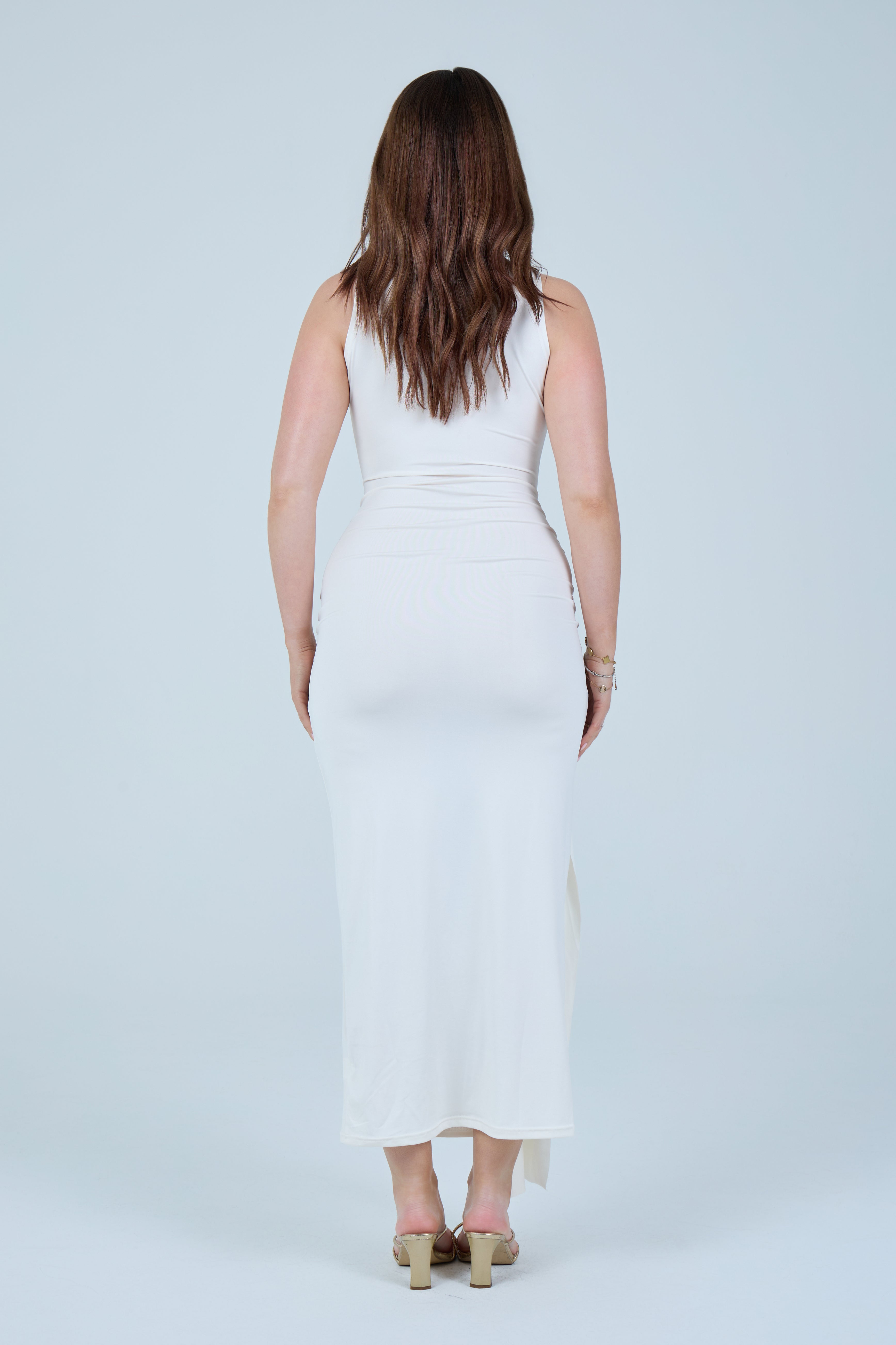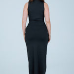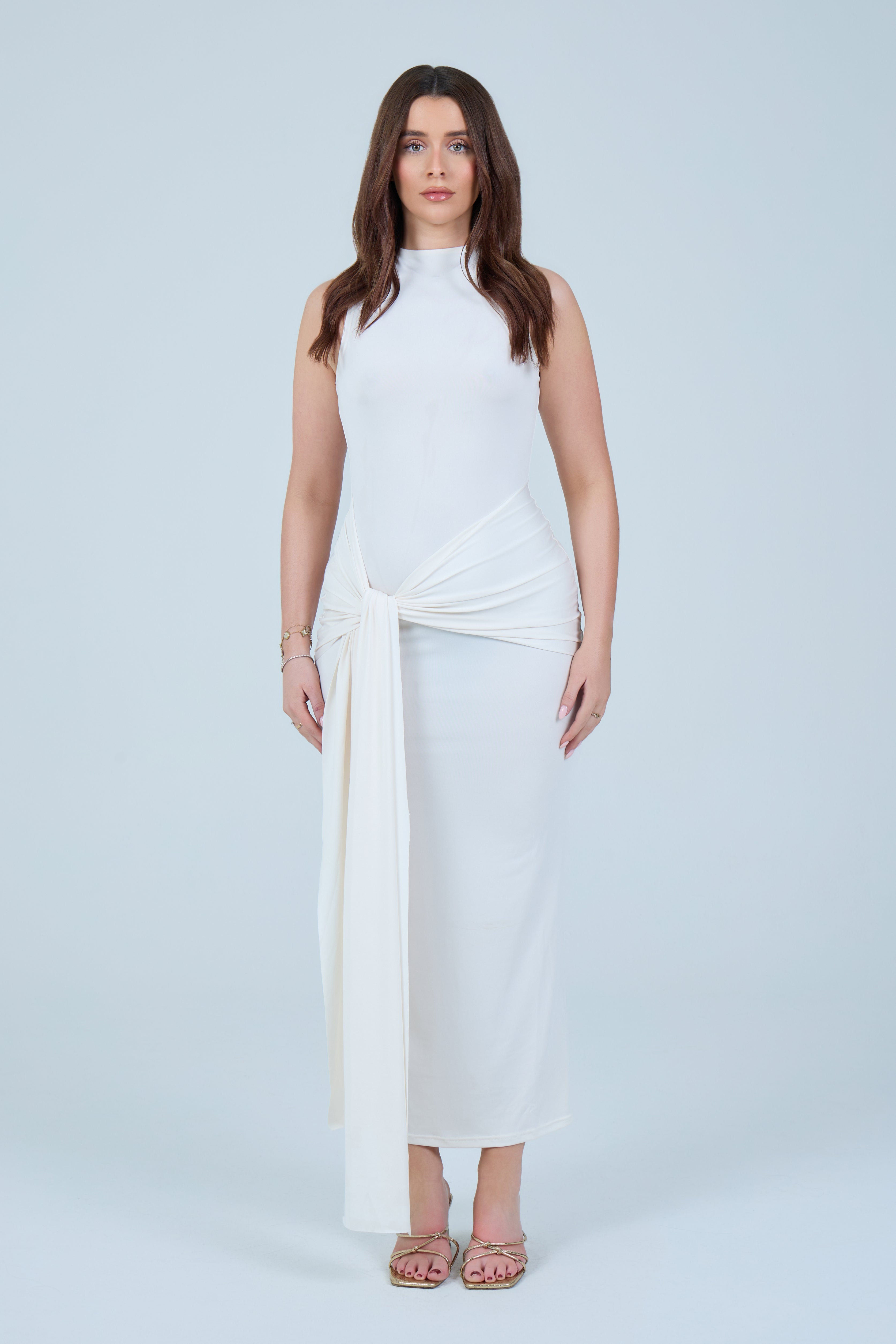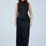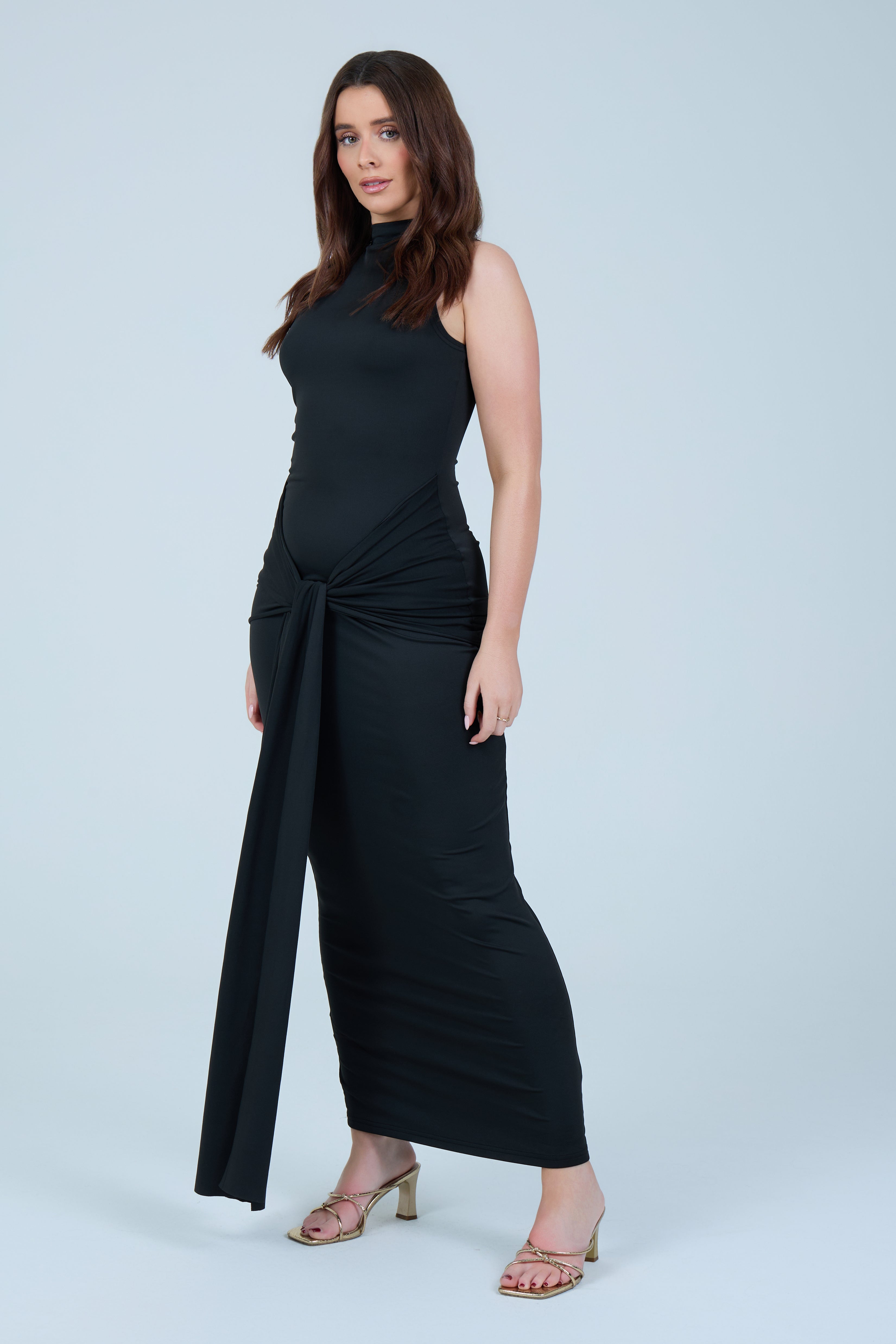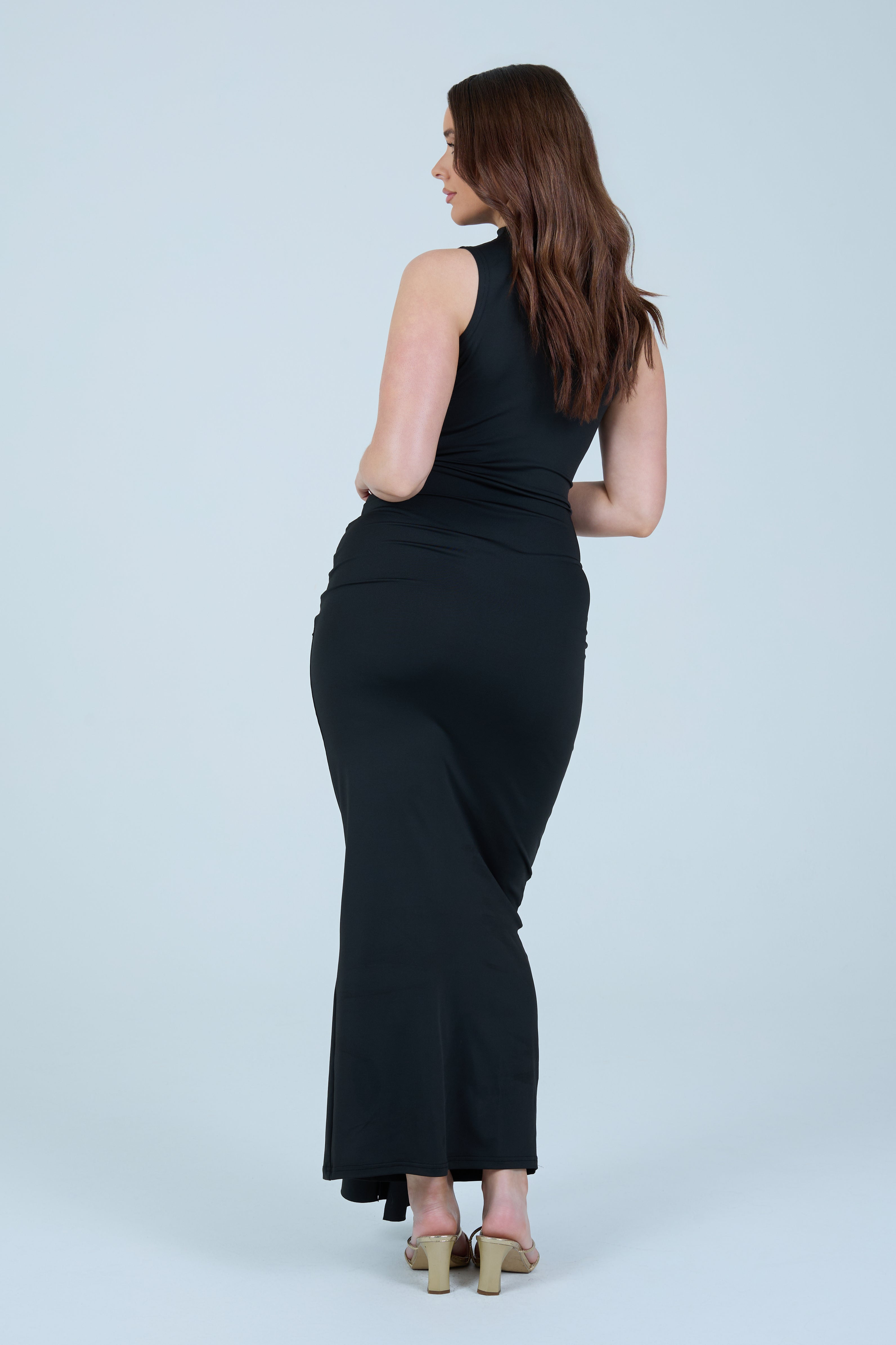 Make an elegant statement with this sleek chocolate-brown maxi dress, designed to flatter the silhouette with refined simplicity. Crafted from a smooth, stretch fabric, this sleeveless style features a high neckline that balances sophistication with modern appeal. The fitted bodice flows into a figure-hugging skirt, enhanced by a gathered wrap detail at the waist that creates a beautifully draped effect. A soft front tie accent adds dimension while subtly contouring the waistline, making this piece both timeless and feminine.