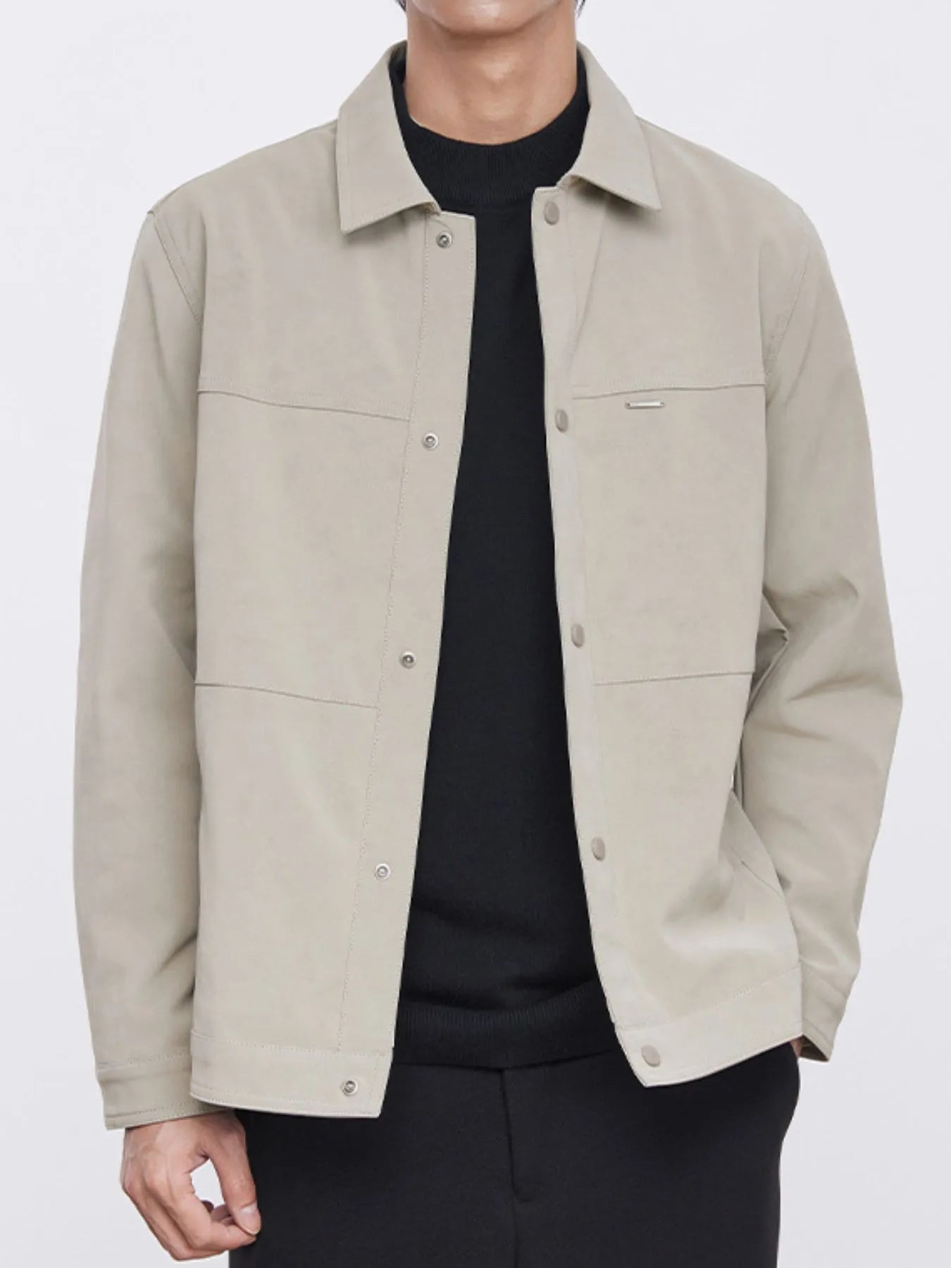 This jacket blends clean lines and matte snap-button detailing for a minimalist yet confident look, perfect for layering over knits, tees, or shirts. Whether styled for a casual outing or an elevated evening ensemble, the Varel Jacket delivers effortless versatility.