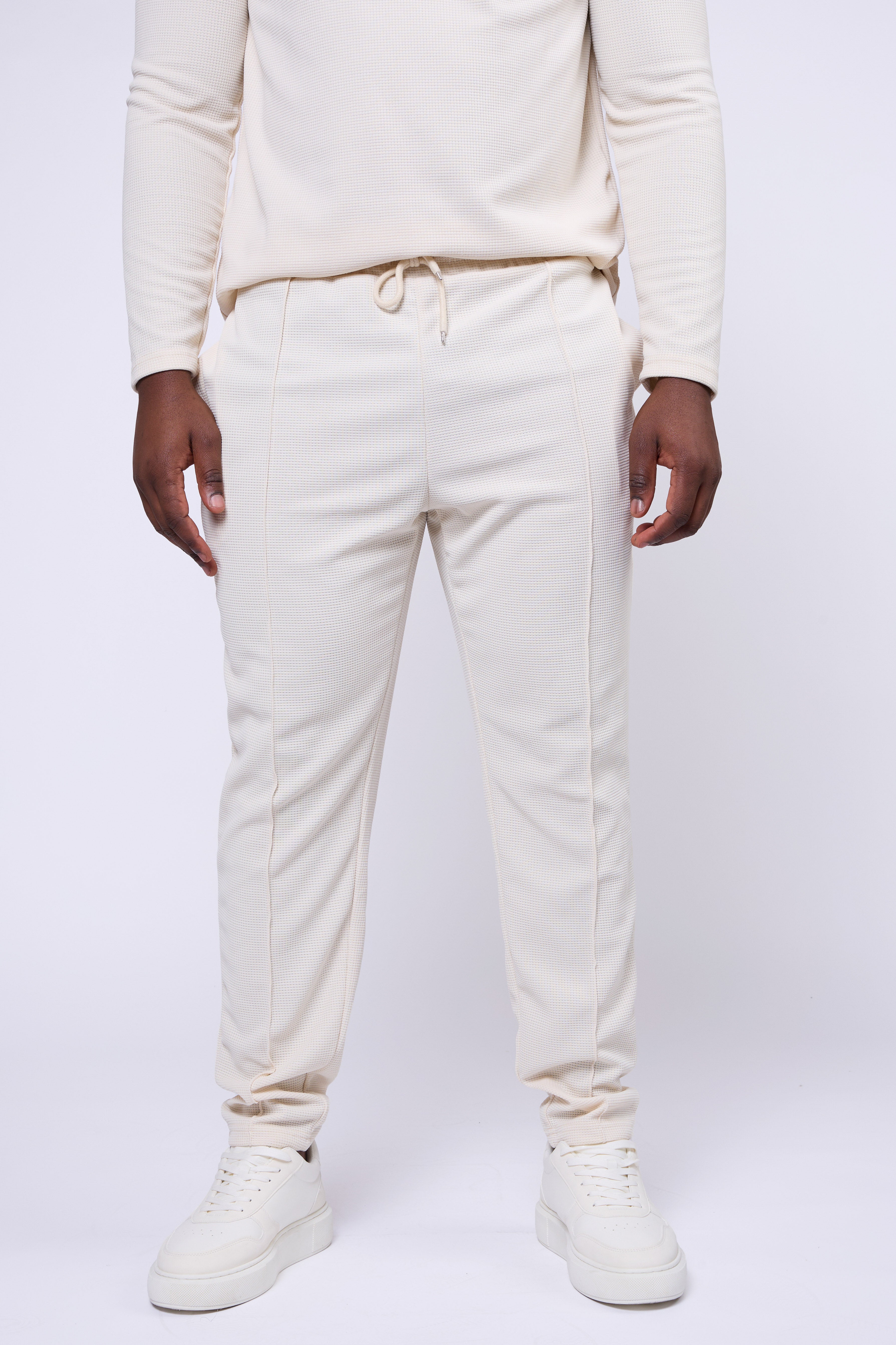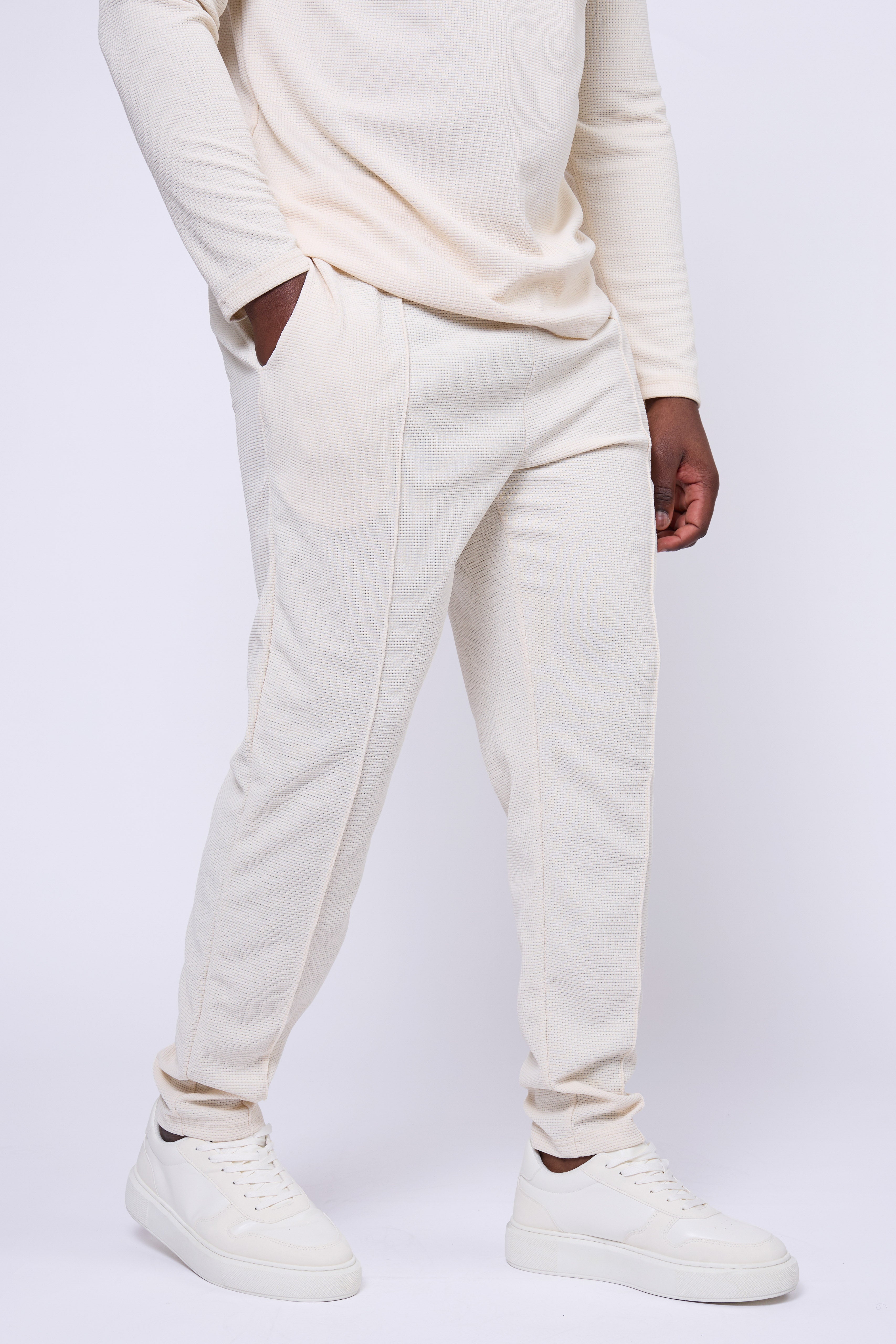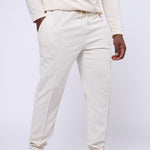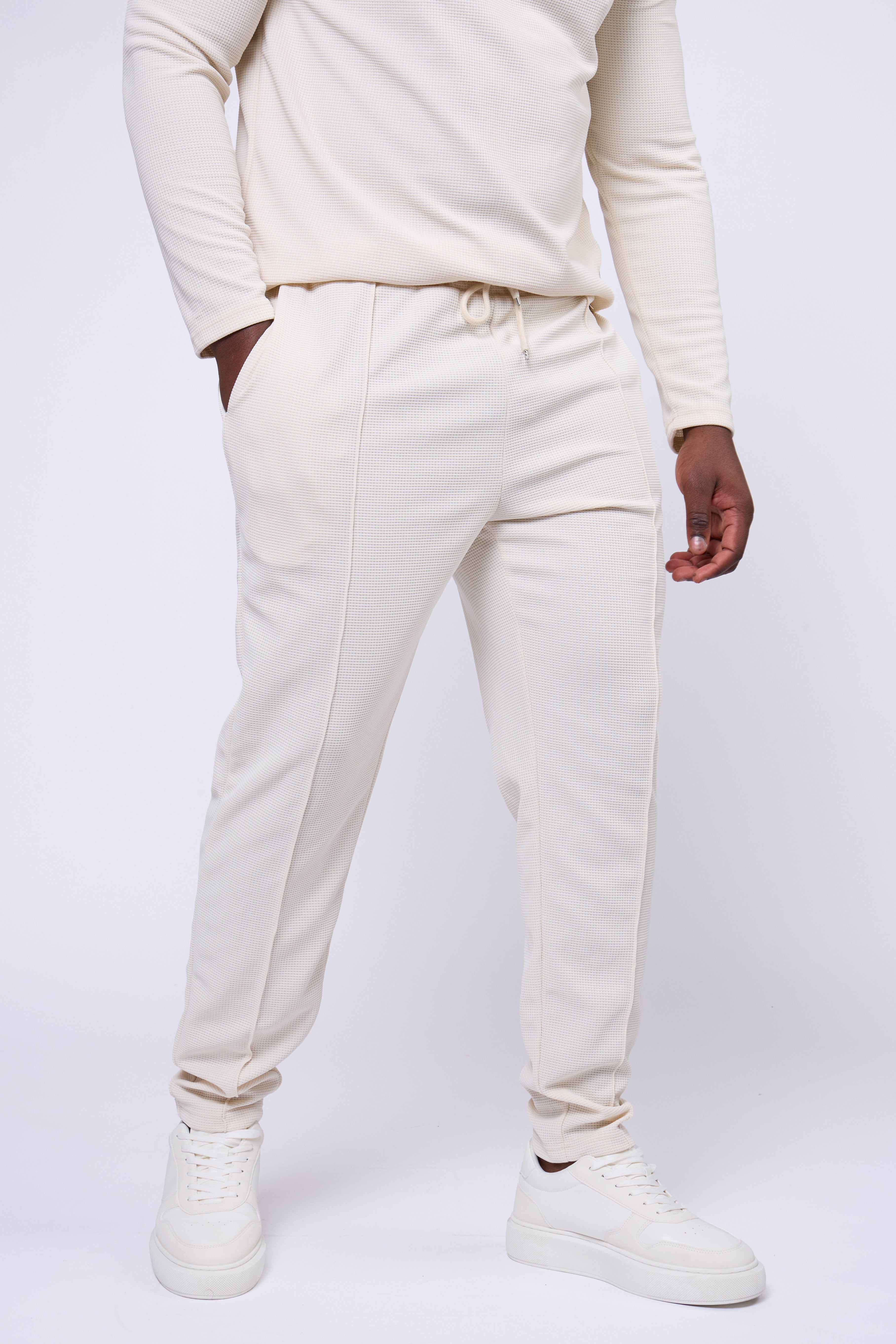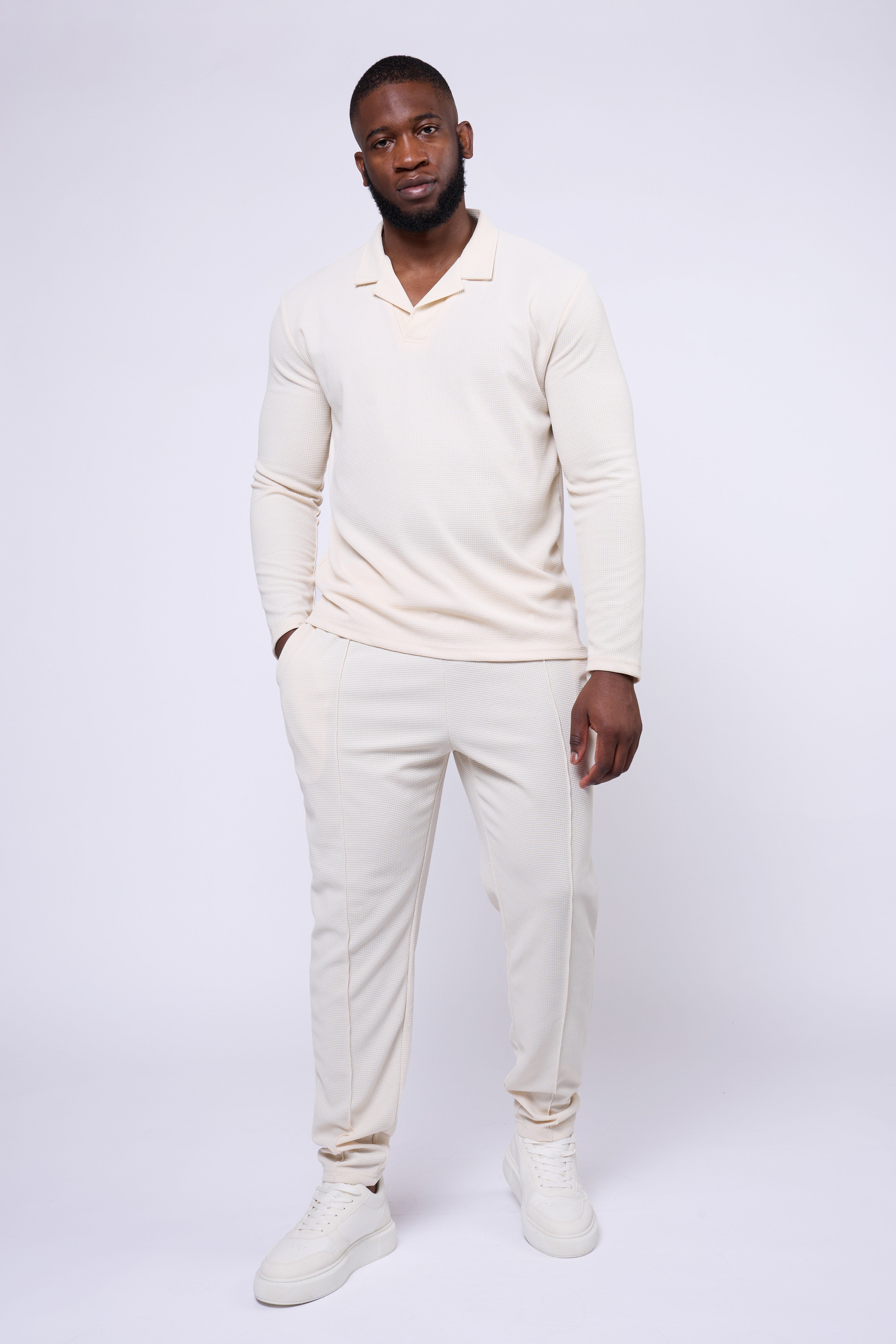The matching trousers offer a refined taper with subtle front seam detailing for a structured appearance. Complete with an adjustable drawstring waist, they strike the perfect balance between smart and relaxed styling.
